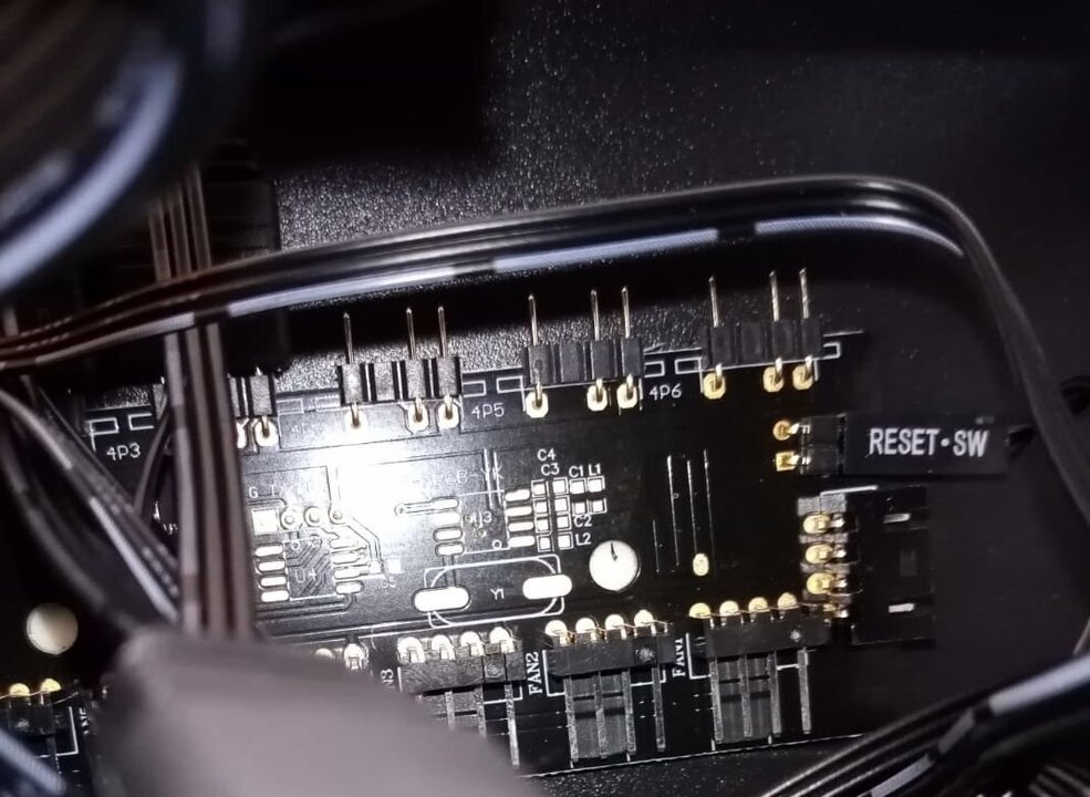 De fan en light controller hub was niet aan het moederbord aangesloten, hing los tussen alle bedradingen.