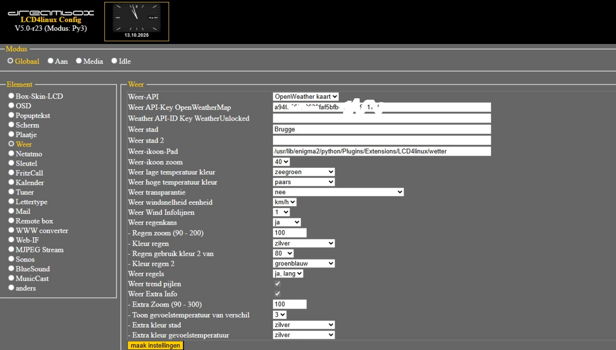 3. Nu de OpenPLI 9.1 perfect werkt op mijn VU+Duo2 had ik graag het weer bericht op de LCD gezien. Helaas krijg ik dit niet aan de praat. Ik wou de openweathermap gebruiken, heb reeds een account aangemaakt en de API code ontvangen maar lukt me niet om het aan de praat te krijgen. Heeft er iemand een werkende LCD4linux config of kan me vertellen wat ik juist moet doen?
