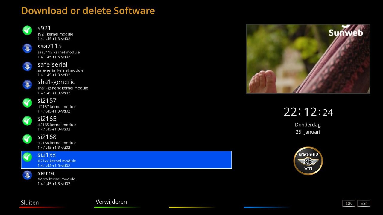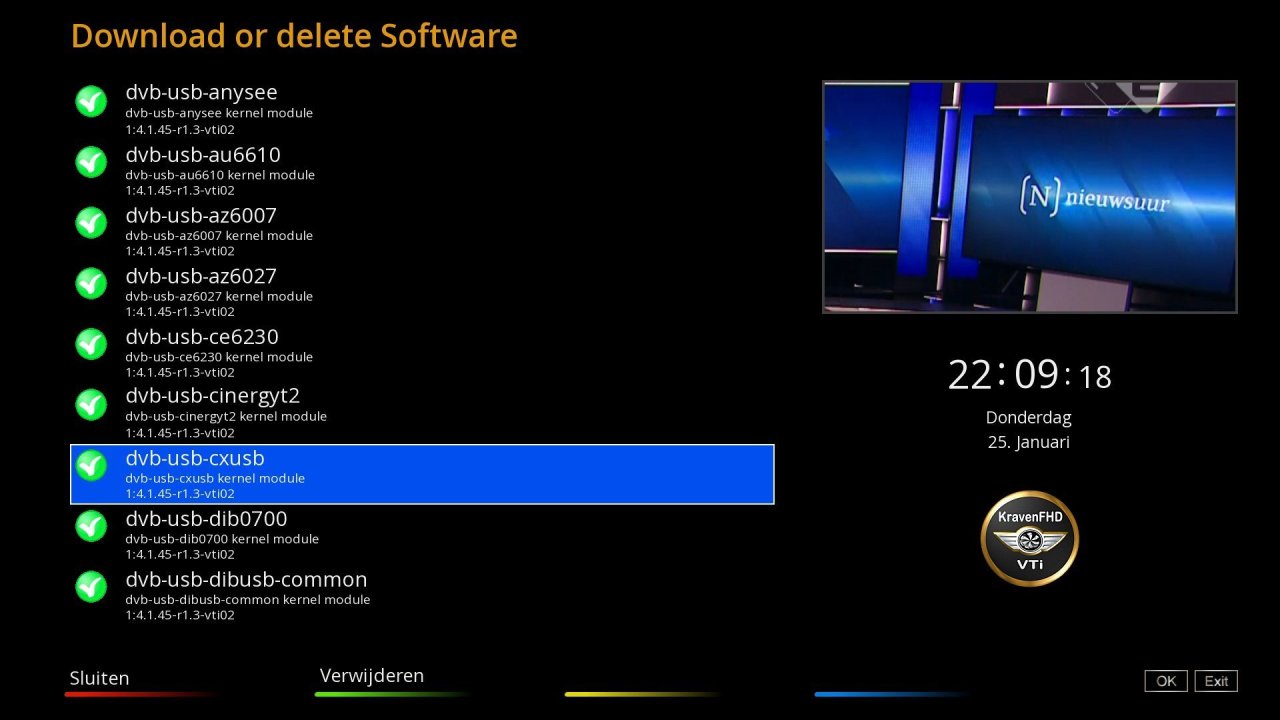 Dat ziet er veelbelovend uit Alex! Alleen jij gebruikt openpli en ik vti, en ik vti heb je niet een menu met drivers, alleen kernel modules en deze heb ik niet voorbij zien komen in die lijst. Kan je een driver van openpli ook in vti gebruiken? Heb dit gevonden op google: https://github.com/Taapat/vuplus-fulan-openpli-oe-core/blob/master/meta-openpli/recipes-openpli/enigma2-dvb-drivers/enigma2-plugin-drivers-ct2-usb-geniatech-t230.bb -