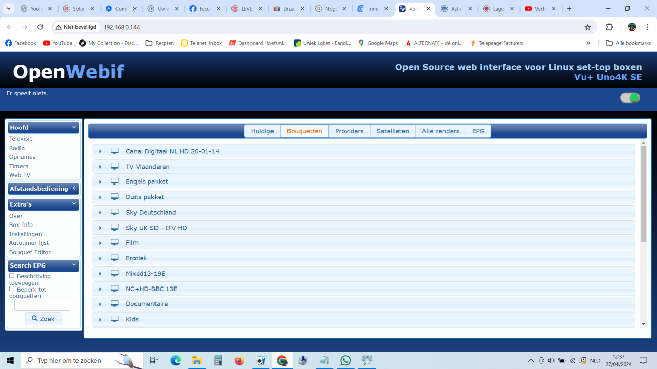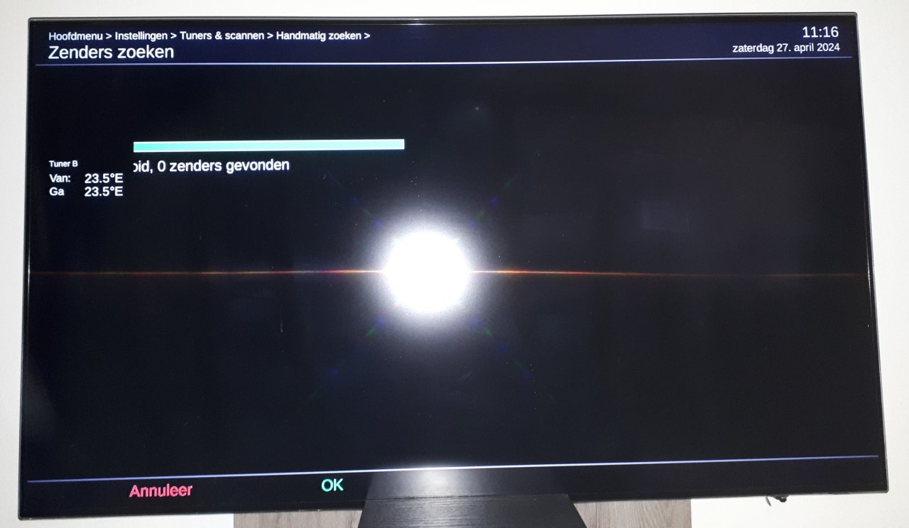 Het al wel een hele tijd geleden. Maar wat ik nu ontdek snap ik echt niet meer. Ter verduidelijking: De gemotoriseerde! schotel staat zo goed als mooi uitgericht. De ontvanger (UNO 4k SE) is voor mij door iemand anders volledig klaar gestoomd. Het enige wat ik bij thuiskomst nog moest veranderen waren de USALS parameters. En joepie, de schotel gaat effectief naar de gevraagde positie. Maar dan komt de grote teleurstelling. Geen beeld. Best mogelijk dat de schotel nog moet gefinetuned worden. Maar het weer liet het nog niet echt toe. Maar ik geef niet op. De UNO heeft een richting gekozen. Welke juist is mij onduidelijk. Maar maakt niet echt uit op dit moment. Dus deze ochtend dan maar heel even de satfinders aangesloten. Bente geeft momenteel 37% kwaliteit op 19.2 E. Kan beter natuurlijk, maar dat is finetunen. Dan de SatLink aangesloten. Maakt een scan. Ik doe maar wat. En krijg tot mijn grote verwondering beeld en geluid. 2 Duitstalige zenders. Maar waarom dan niks op de UNO? Ik geef nu zeker en vast niet op. Alleen het weer speelt nog even de parten. -