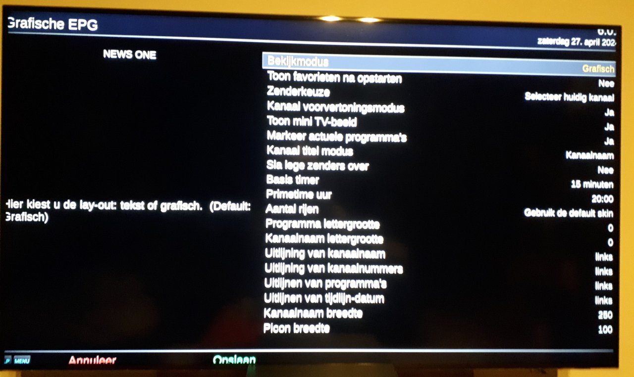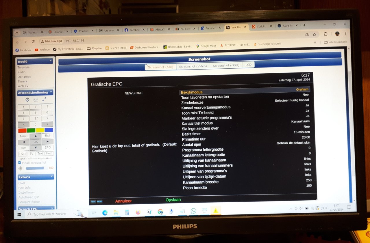 Vooreerst het volgende nu: Als ik het menu van de One open, staan er een hele hoop buiten het scherm van de tv. Helemaal linksonder zie ik in het blauw "elp" Linksboven: oofdmenu. de H is niet echt zichtbaar. Rechtsboven: de tijd? Ja, maar. De datum: vrijdag 26 april. 202 Men tv is een 1080 breedbeeld. Dus laat ons eerst dit euvel op lossen. Maar dan wel ergens anders ook beter nieuws. Ik heb beeld en klank. Maar alleen als ik via PC afstem. Afstandsbediening? Enkel channel up en down. En dat is ook alles. Rotatie van de motor moet ik nog effe uitzoeken of dit werkelijk juist zou zijn. Maar er is beter weer opkomst. Dus UNO en PCmonitor naar buiten (ben ook maar alleen) en tunen. -