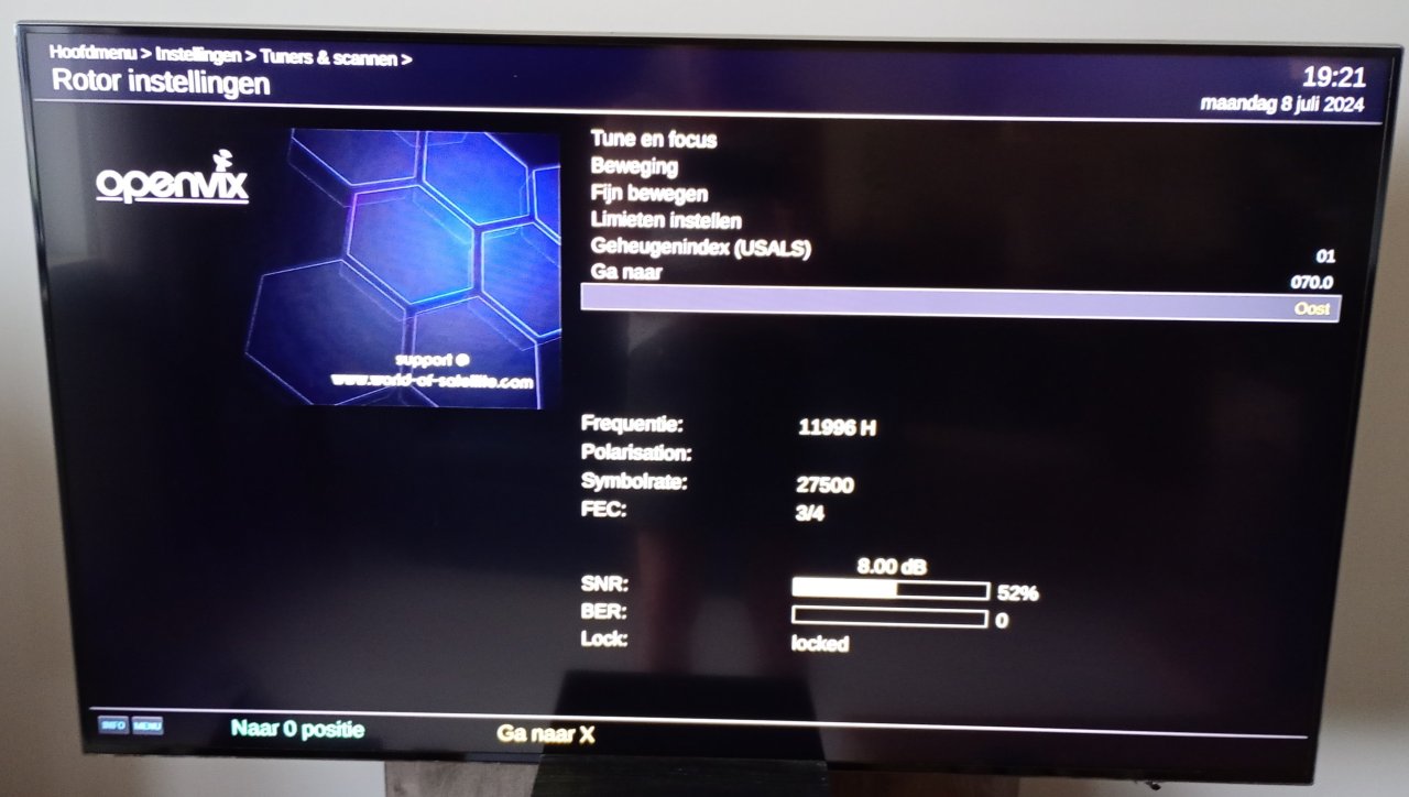 Met de vorige rotor was het van: doet ie het of niet? Gewoon een nieuwe aangeschaft. Maar deze heeft dan wel Moteck op zijn lijf. En ondanks alle heel goede raad die ik hier kreeg. Ik heb mijn boerenmanier gevonden. Op de muurbeugel na, alles binnen gehaald en op de werkbank. De theorie naar praktijk zetten. Volgens de handleiding zou de elevatie op 22.6° moeten staan. Even een gradenboog erbij. En aftekenen. Instellen. En dan terug monteren. Horizontaal nog niet te vast. Moet nog uitrichten op 4.8 oost. Maar dan. Ik ben wel even nieuwsgierig wat de uitersten zouden kunnen zijn. Dus de VU+ via rotor instellingen het uiterst oost en west gecommandeerd. 75° aub. Geen obstakels voor de beweging. Gebouwen laat ik even buiten beschouwing. Maar tijdens deze beweging zie ik op een bepaald moment ontvangst. Welke sat weet ik niet. Maar het geeft mij wel al ergens hoop. OK. Commando: Ga naar 0. Wat? Sterk signaal en een Lock? Ok, scan dan maar. Beeld en geluid. Das Erste. 19.2 E. Boerensjans? Maakt niet uit nu. Ik kan al verder met het correct instellen. Maar vandaag niet meer. -