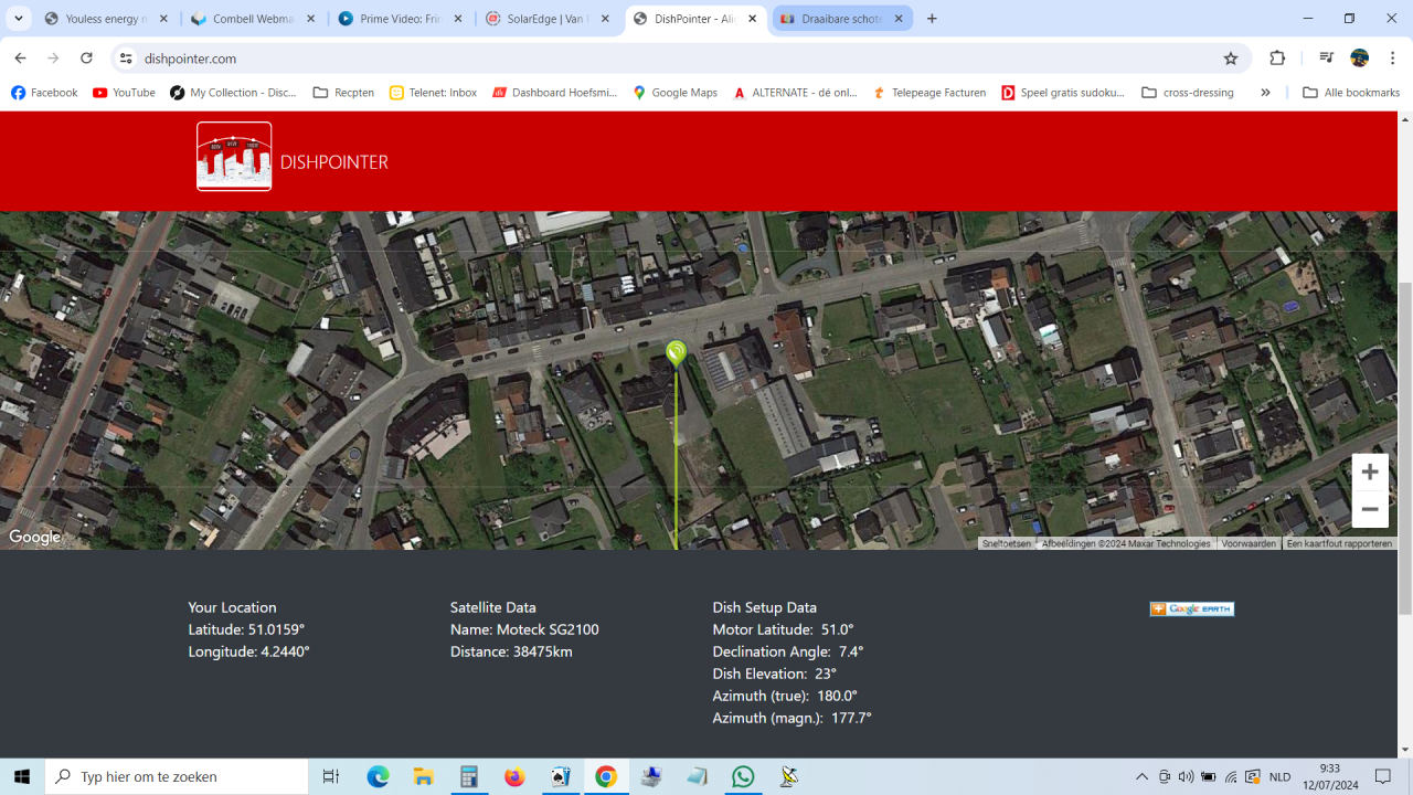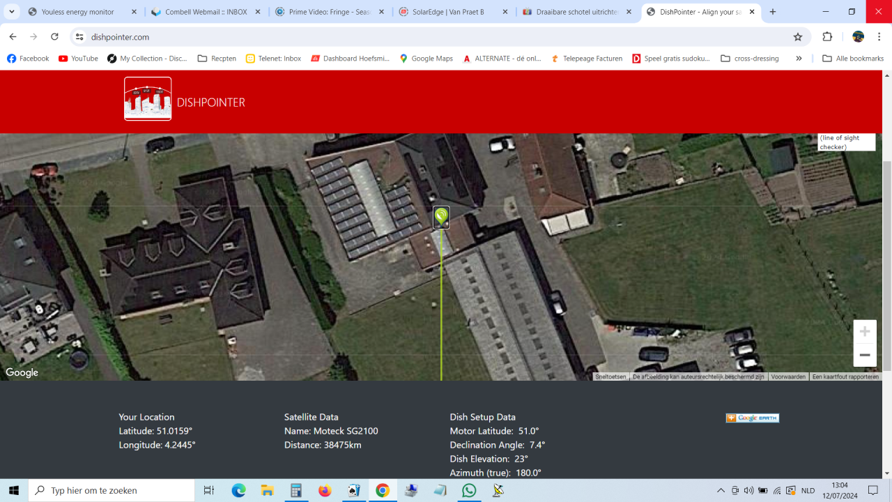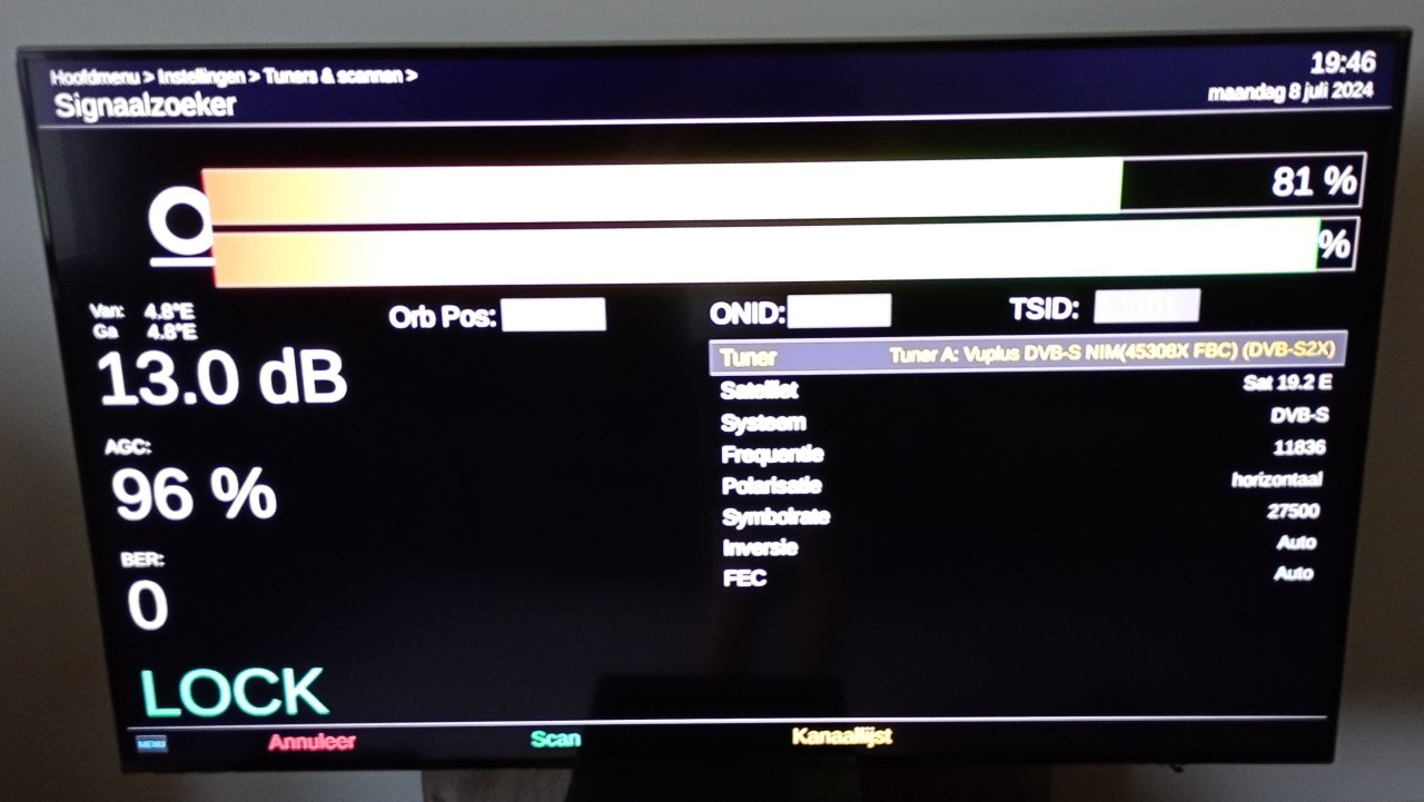 Dat weet mijne kleine teen intussen nu ook al wel. Als je ooit in de buurt zou zijn, die snoepwinkel heeft heel lekkere creemgelas.En wat betreft USALS. Deze staan ondertussen helemaal juist in de ontvanger. Met dank aan @stevenvc19 voor het rechtzetten van mijn eerdere fout. Maar dat verklaard dan nog steeds niet het waarom dat ik nu wel al ontvangst heb op 13.0° en 19.2°. Wide Beam? En dat het niet echt uitmaakt dat de schotel niet in het brandpunt staat van betreffende satellieten? Ik gis maar wat. In de printscreen zal je wel zien dat USALS juist is. En de andere foto's geven dan een beeld vanuit horizontale toestand. -