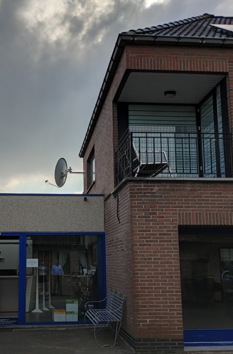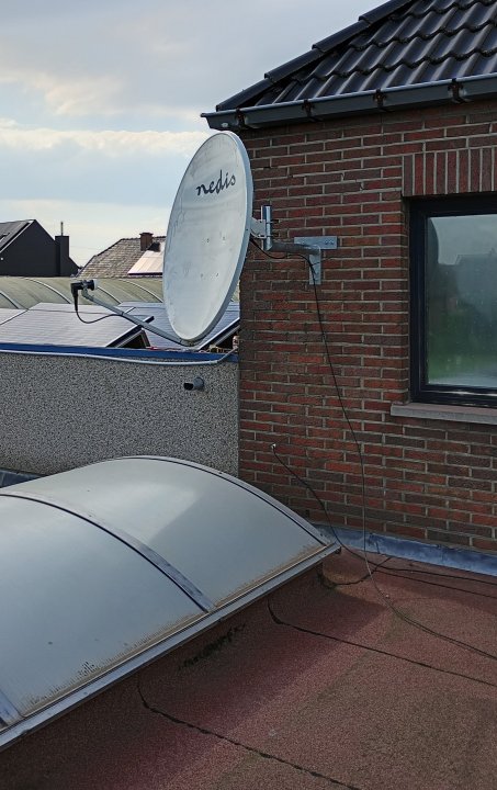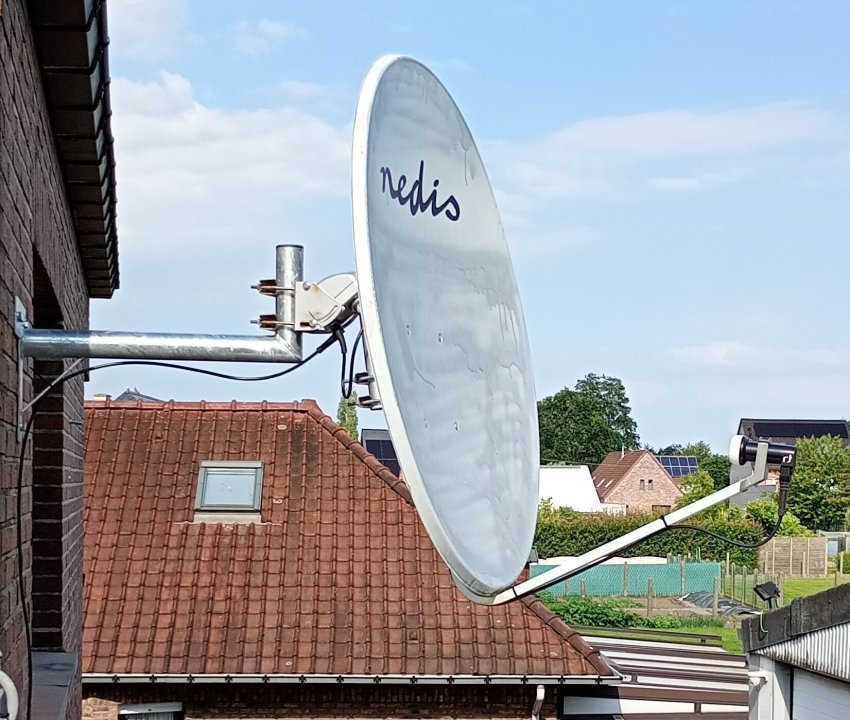 Na zoeken, zweten en hard labeur. Ergens komen we aan een oef. Nu nog fine tunen. En we zijn er. Balkonstaander heeft afgedaan. Muurbeugel in de plaats. 60 mm buis. Overdreven? Motor doet het. Draait oost en west. Staat nu op 0.8 west en heeft 6 zenders gevonden. Wel nog geen beeld. Tuner heeft schotel naar daar gestuurd. Niet zeker dat het juist zou zijn. Maar dat maakt nu niet uit. Het voornaamste is nu dat er dan toch iets binnen komt. -