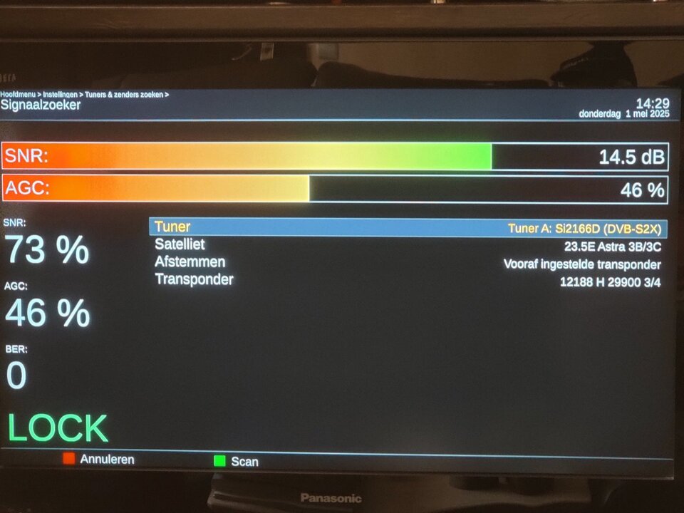 De twin LNB is in orde en heb deze ook al vervangen door een nieuw exemplaar om zeker te zijn. De beide coaxkabels zijn getest en ook in orde. Zonder een programma op te nemen heb ik op beide tuners en op beide frequenties of zenders en polarisatie perfect beeld en signaal. Ook de tuners heb ik apart getest, de ene uitgeschakeld via het menu en omgekeerd. Dus de tuners lijken ok ,de lnb lijkt ok alsook de coaxkabels.