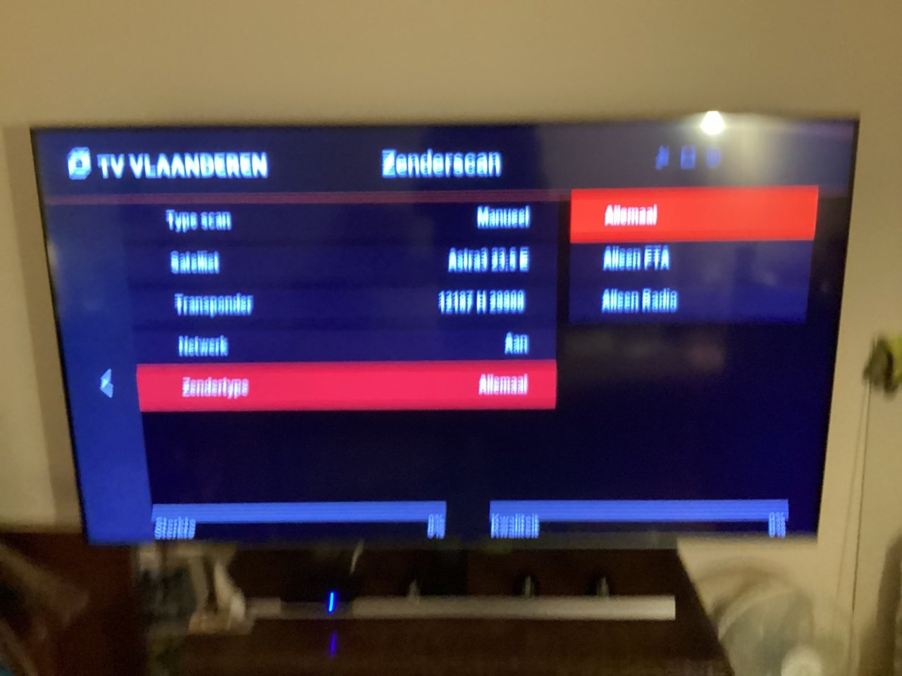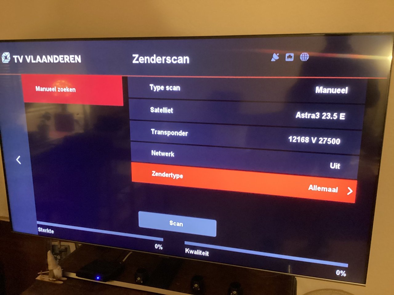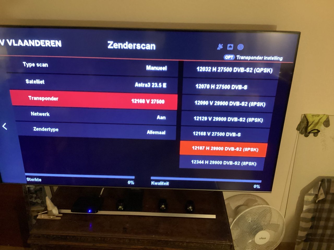 Ik moest even de pelletkachel bevoorraden en dan is het nu te donker om nog verder te werken buiten . Nu weet ik echt niet wat een transponderlijst is , sorry voor mijn gebrek aan vakkennis . Ergens bij instellingen staat wel iets van een software update , wat ik ook gedaan heb . Tot voor kort keek ik zonder haperingen naar mijn programmas . Twee jaar geleden heb ik op goed geluk met kaart kompas de schotel gericht en had ik na drie pogingen mooi beeld . Ik verplaatste even de schotel , onlangs , door werkzaamheden op mijn terras . Dan had ik ook gewoon beeld maar met kleine storing af en toe , twee sec. bevroren beeld . Dat wou ik verbeteren en plaatste een week geleden de montage mast op vier bouten waardoor ik met behulp van moeren de stand van de schotel heel zachtjes kon wijzigen en toen had ik geen signaal meer . -