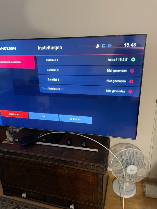 Schotel hangt terug op eerste plek . Met kompas op ongeveer 180gr gezet , helling ongeveer 41 gr . Ik had direct astra 28 en die zit op 172.65 gr . Dan heb ik de schotel wat verder gedraaid en toen had ik zowel astra 2 als astra 3 ergens onderaan in beeld gaf de sterkte 63% aan en 37% kwaliteit maar geen tv zenders . Dus moet ik straks nog wat verder zoeken . Het is bewolkt dus die kleefband afstelling zal niet lukken . -