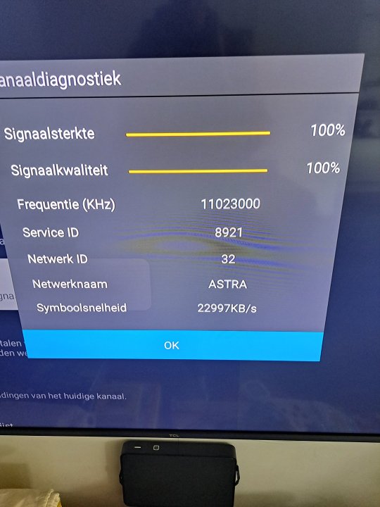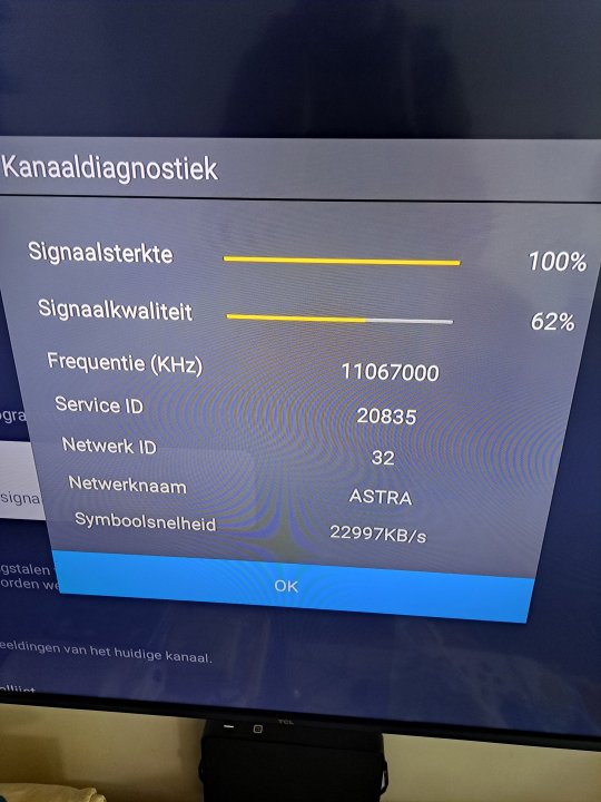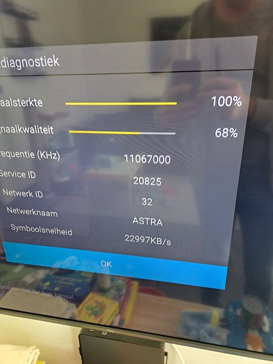 Installatie klaar, dit is het resultaat volgens mijn tv. Op mijn satfinder zie ik enkel een ontvangst van 87%. Quality signaal 0%. Edit: kan geen filmpje posten?