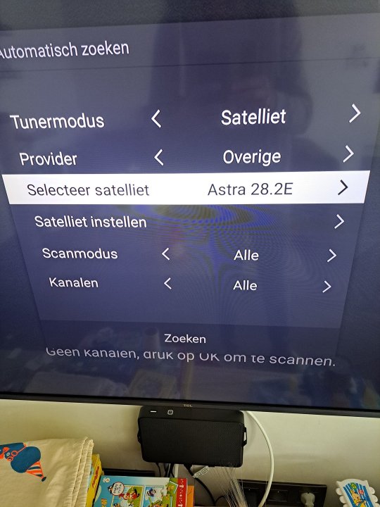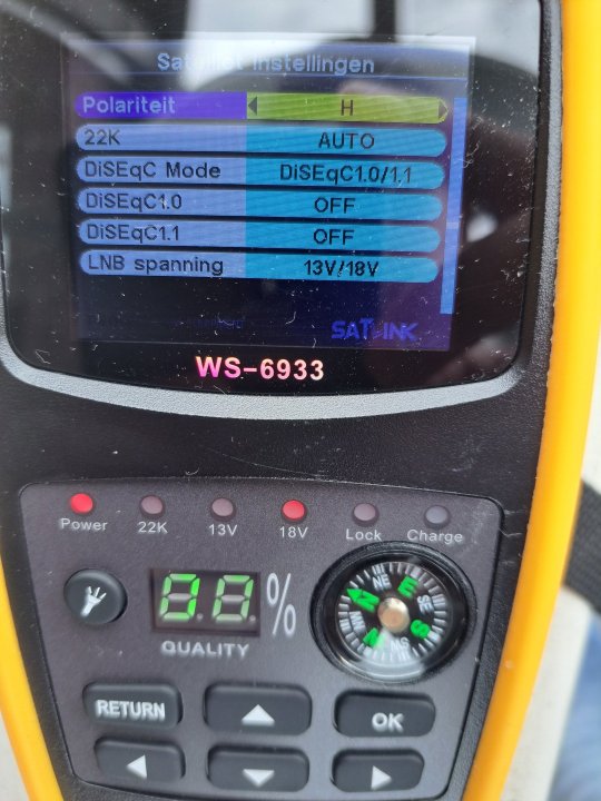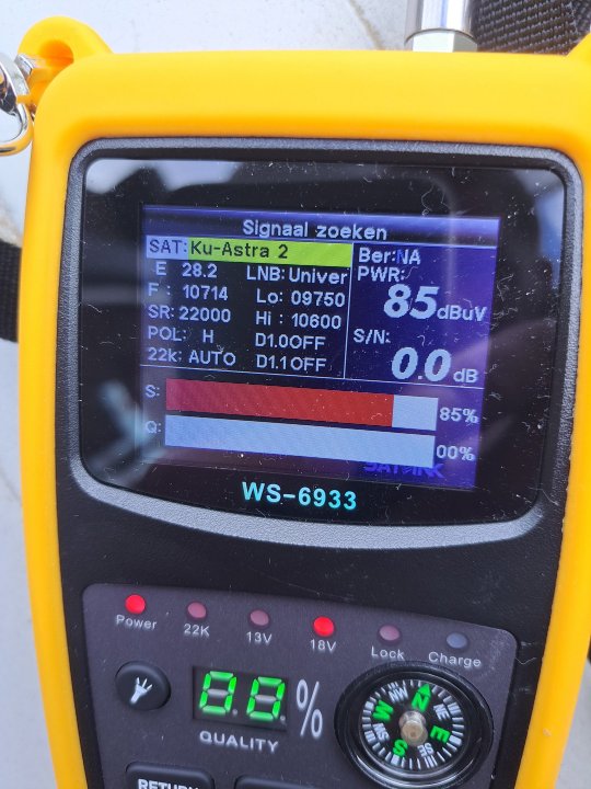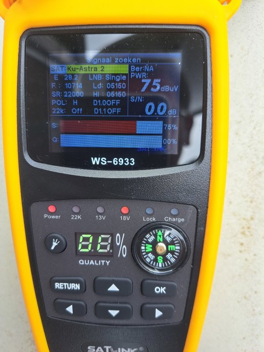 Satfinder begon plots te piepen en dacht dat ik de 28.2 eindelijk had gevonden, maar verder dan dit raak ik niet. Ik geef het op, zal het onderschat hebben om zomaar even een schotel op te hangen 😔