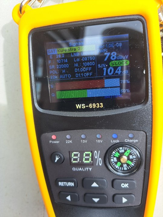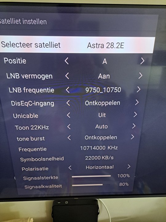 In afwachting van aankoop schotel + muurbevestiging (is voor volgende week), deze aangekocht zodat het zoeken wat beter zou moeten lukken. Volgens de verkoper is 70% voldoende zowel bij ontvangst als bij kwaliteit, want zegt hij: "hoe hoger de ontvangst hoe minder de kwaliteit"...