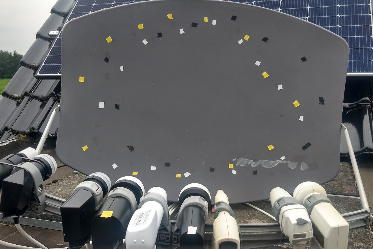 Nog even een test gedaan om het ontvangst gebied van de verschillende lnbs te bepalen. Dit door een metalen plaat van de rand richting centrum te bewegen zodra de ontvangst afneemt heb ik tape geplakt. Het wordt opeens wel duidelijk waarom deze schotel nauwelijks meer gain heeft dan een T55.
