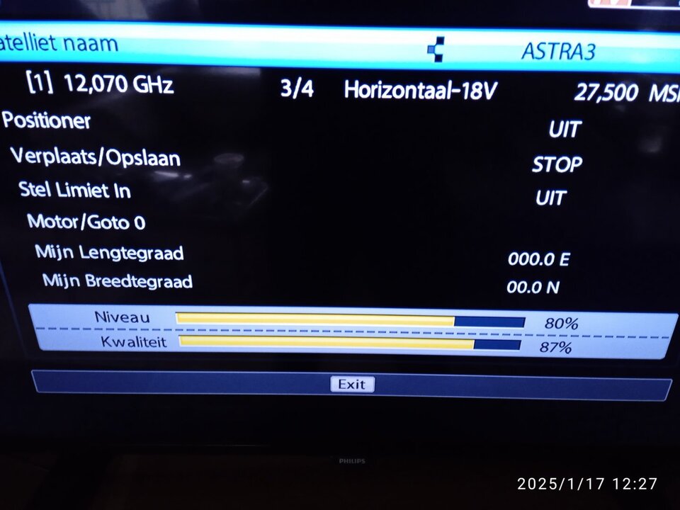 Aan de voeding mankeert niets ,als je een dsr 8141 eerste x opstart ,wil die eerst een update via de satelliet ,maar die updates zijn er niet meer dus blijft die daar in hangen , misschien was er een mogelijkheid om ergens bij iemand een update op usb te krijgen en zo in te laden ...zo kan ik mijn tv ook updaten , Nu het tv decoder onding verhaal ,lnb houder is vervangen lnb staat 100% terug vast ,heb de elevatie ook terug moeten goed zetten 29,9 ,de schotel afgeregeld op een sab decoder ,fijn getuned zo goed mogelijk ( veel te koud ) astra 3 signal sterkte 82% kwaliteit 88% astra 1 78/84 en astra 2 78/85% ,goed dus ,coax in de m7 zelfde ontvangst waardes ,coax in de tv astra1 /2/3 geen signaal ,sprietje heeft gelijk Philips tv,s zijn krengen 😂bij beter weer gaat de tv mee naar buiten en ga ik het afregelen nog eens via de tv proberen ....dan staat die ook al dichter bij mijn remork 😄 -