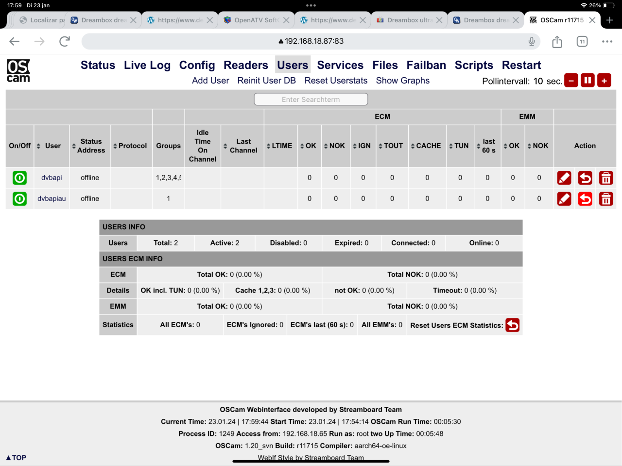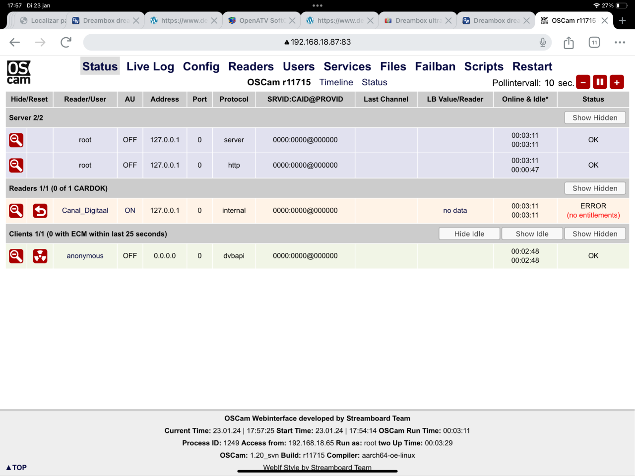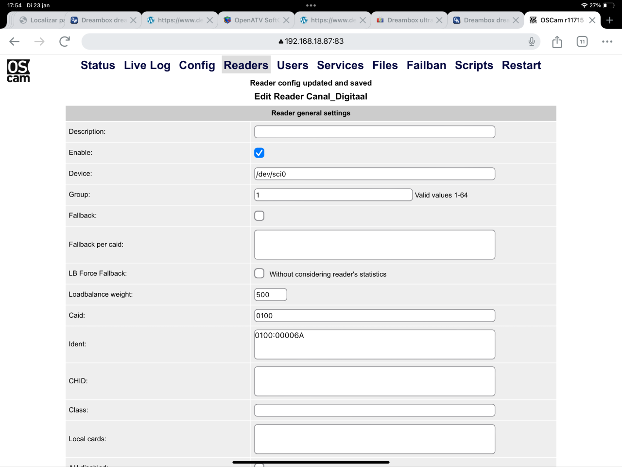 Beste lezers, Ben een beetje gestrest omdat het installeren van een softcam niet lukt. Ik heb een nieuwe dreambox ultra 2 gekocht en ben deze nu bij mijn moeder in Spanje aan het installeren. Ik heb voor het openATV image gekozen omdat ik die de mooiste vond. Helaas zit er geen softcam download sectie in deze image. Met veel moeite een ipk bestand kunnen installeren vanaf een sd kaart. (Ik heb geen windows pc hier voor putty) alleen een ipad Ik moest de bestanden meerdere malen installeren voordat er eindelijk een softcam menu verscheen. Daaruit kon ik alleen de Oscam stable installeren. Deze in het menu gevonden en op gestart. Werkende canal digitaal kaart erin maar geen beeld? eerste vraag, moet de chip van de smartcard naar beneden of beneden? tweede vraag, welke softcam moet ik gebruiken en hoe kom ik daaraan en hoe krijg ik deze op de box? stres is dat ik nog maar 2 dagen heb alles werkend te krijgen.
