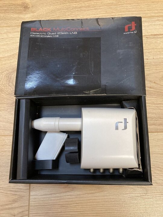 Oeps , bij het inpakken schoot me te binnen dat deze hoorn een andere flens configuratie heeft en niet direct op een standaard flens lnb past . Dus heb ik de oude eraf gedraaid , een passende flens gemaakt en er aan gezet , tevens een pvc verloop ring set gemaakt zodat het in een 40 mm klem past
