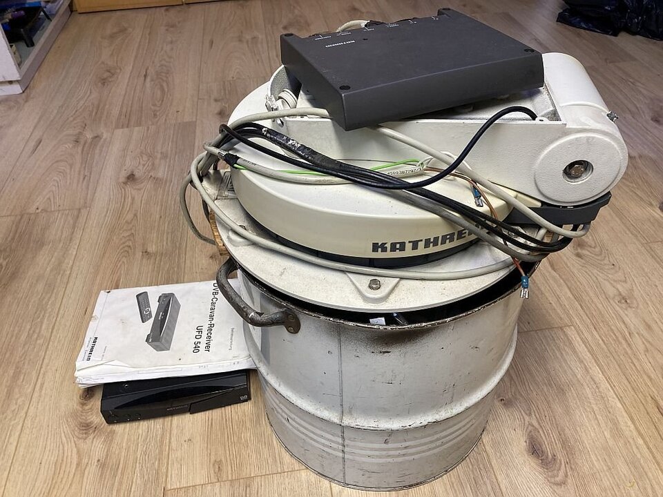 Zelfzoekende Kathrein vlakschotel met stuurkast en bijbehorende ontvanger . Schotel geeft niet genoeg signaal voor de Nederlandse kanalen op 23.5 . Met een nieuwe moderne vlakschotel of ombouw met offset schotel wel mogelijk . Een tweede zelfde schotelunit (geen stuurkast/ontvanger) er gratis bij . Van één unit is de schotel niet gemonteerd maar is er wel bij .