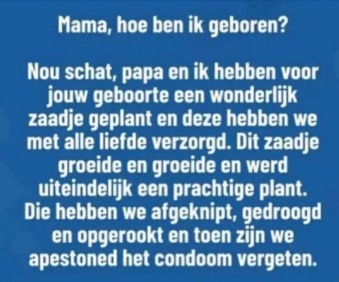 23. zo kreeg ik toen de kinderen nog klein waren een verontruste ouder aan de lijn. "wat hoor ik nu van mijn dochter wat eten jullie in hemelsnaam" Toen dochterlief vroeg wat we gingen eten was het vooraf dooide koeienstaarten soep, (ossenstaartsoep) en dat was blijkbaar vreemd en was deze ouder nogal verontwaardigd. Dus ik vroeg "snijden jullie de staart dan soms levend van de koe"? Het was even stil en toen viel het kwartje pas.😁 Mijn vader zei altijd tegen de kinderen "getver, wie eet er nu dooie vis"? (hij hield niet van vis als het geen kibbeling was)