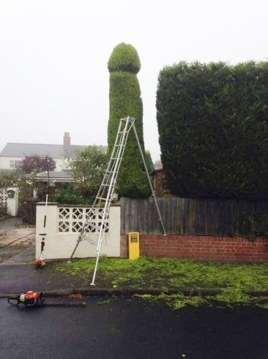 Ik was de coniferen aan het snoeien, toch de ladder te kort. (of de conifeer te hoog) iemand een idee? Dit ziet er zo wel lullig uit voor de buren.