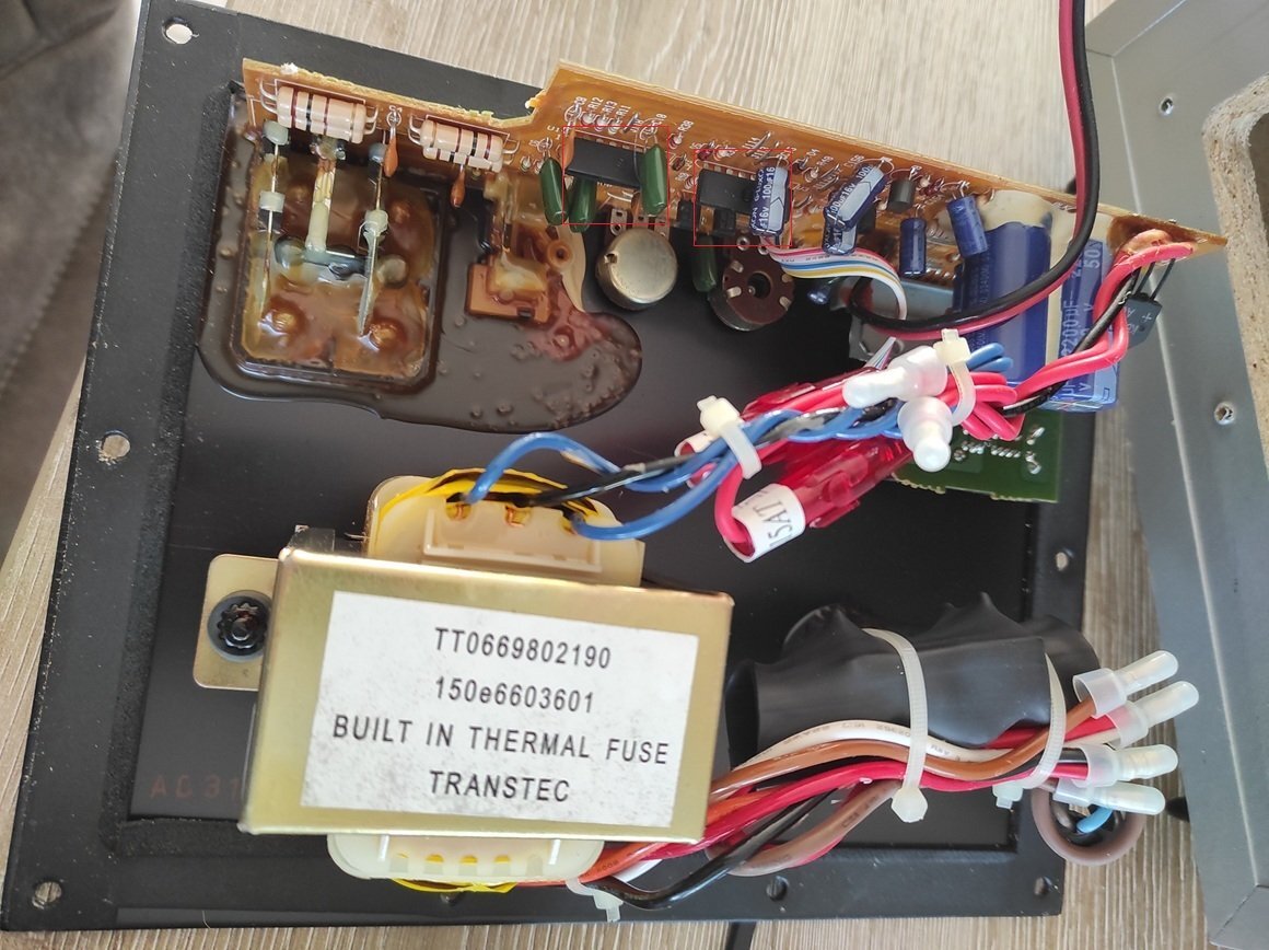 Probleem ligt ook niet bij de receiver aangezien mijn vriend ook al klaagde dat hij plots geen bass meer had. Heb de sub even opengedaan en alle 3 de zekeringen uitgemeten en die zijn ok. Verder zie ik ook geen elco's ofzo die bol staan. Na wat opzoekwerk zou het mogelijks met deze componenten te maken kunnen hebben (zie foto met rode omlijning).