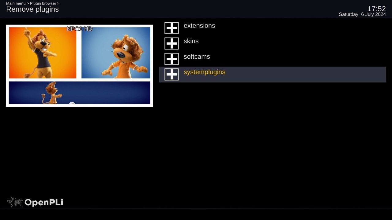 Ik zie het al .... bij mij heet dat menu "Plugins". Helder. Verwijderen En dan druk ik op de rode knop (remove plugins). En dan vind ik "settings" niet. Wat ik wel zie is: extensions, skins, softcams en systemplugins. @mebo870 heb je nog een laatste tip? -