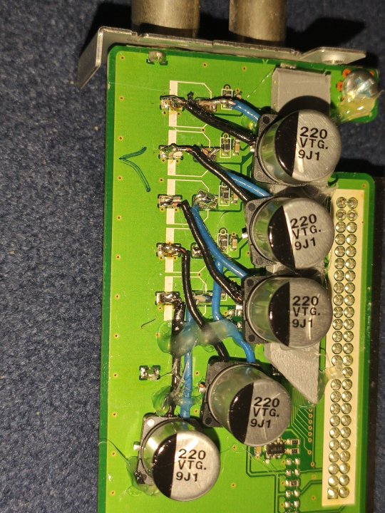 Print banen van de insteekkaart zien er prima uit, nu teruggeplaatst met nieuwe condensators. Die waren een beetje groter dan de oude (25V ipv 16V) dus wat moeten knutselen met draadjes en liijmpistool: @bellejtHier een foto van het moederbord. Geen van de condensators is bol en ik zie nergens zichtbare problemen aan deze zijde van het moederbord. Ih heb hed bord nog niet gedemonteerd om te zien of de onderkant goed is. de condensators van de voedingsprint zijn allemaal vervangen, behalve de 1uF bovenaan-rechts. Die zat niet bij de bestelling. De 0.47uF onderaan links is vervangen door 2x1uF serieel en de 120uF door 100+22uF parallel Als je nog tips hebt dan hoor ik t wel. Met de nieuwe condenzators op het insteekkaartje doet hij het nu al een paar uur goed. Ik zal m de komende dagen in de gaten houden.