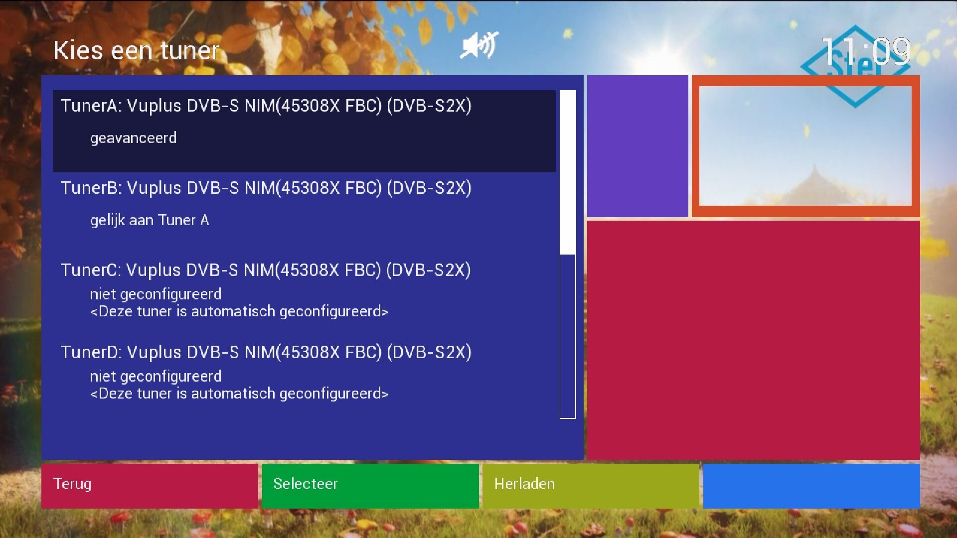 Dat doe je in het tuner configuratie menu. Alleen ontbreekt die optie in jouw ontvanger. Dat zou kunnen komen doordat de tuners niet herkend worden door de software, Ik denk dat je er niet aan ontkomt om de ontvanger opnieuw te flashen. Dat doe je in het Tuner configuratie menu.