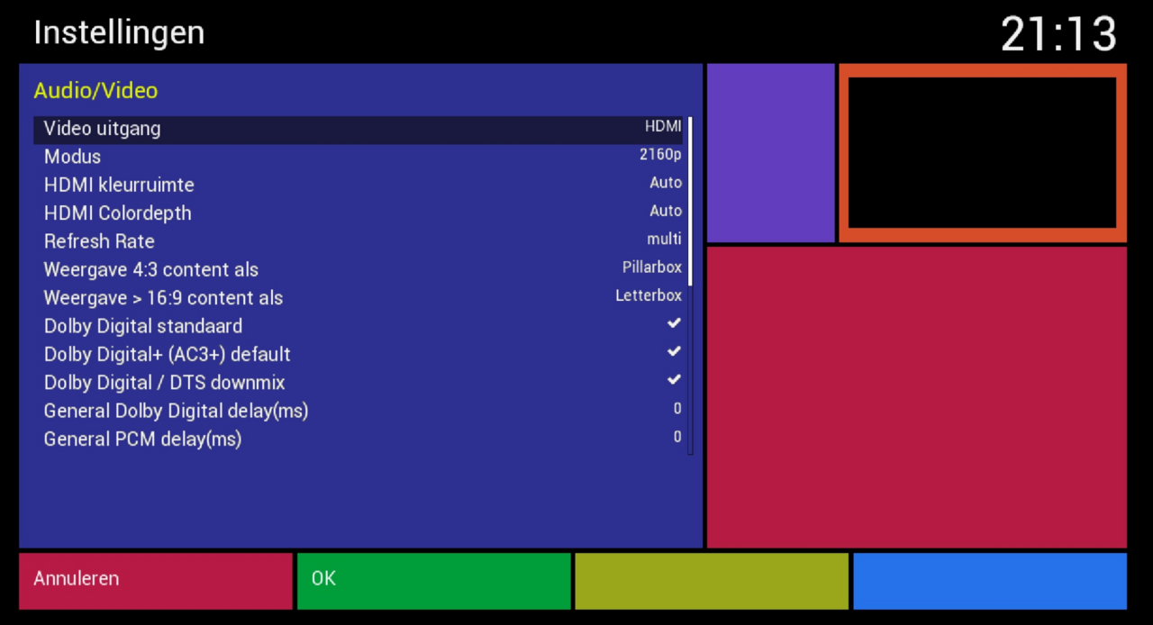 Nee, dat is niet het audio menu. Je hebt nu denk ik weer de gele toets ingedrukt, maar dat is niet het algemene audio menu bij de settings. Zit er geen "menu" knopje op je afstand bediening?