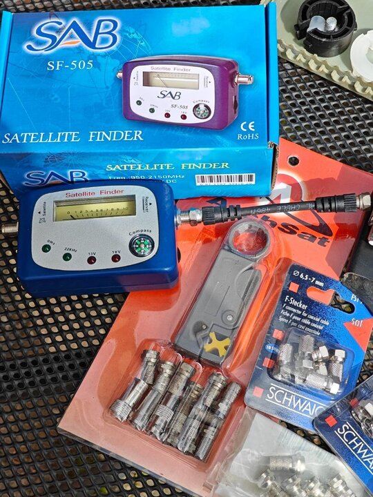 Een Wavefield Toroidal T90 schotel met zes LNB montagebeugels, muurbeugel en een mast van 2 meter.