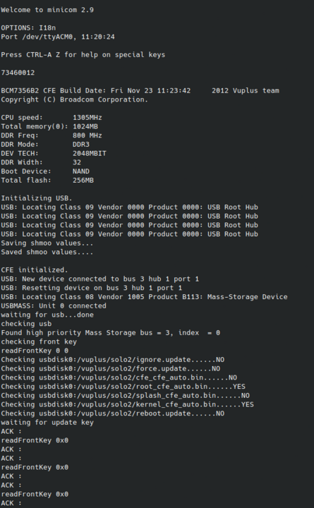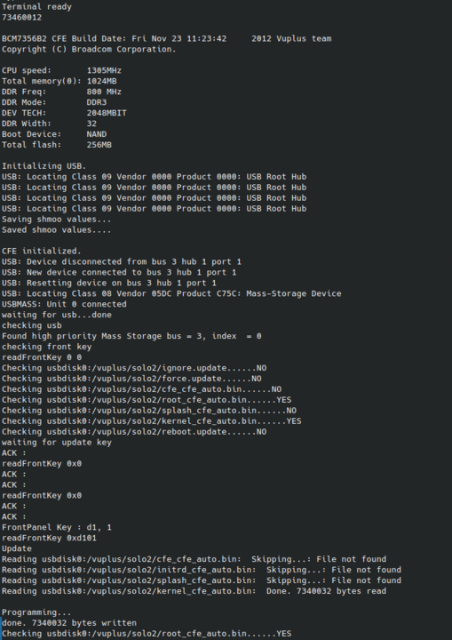 Goed, eindelijk weer echt tijd om weer eens verder te troubleshooten .. en nu met de juiste UART interface tools Het ding heeft bijna nu 2 weken niet aan de stroom gezeten, maar er is iets verandert lijkt het want .... Een USB met de backup van mijn VTi install wederom in de box gestoken, en ziedaar ... er is leven en hij ziet de twee files op de USB Nu ga ik eens uitzoeken waar de schoen heeft gekneld, want ik heb het niet anders gedaan dan wat en hoe ik het nu deed De bovengenoemde padden waar de solo2 in zoekt, heb ik elke keer gebruikt .. raar. Ga nu kijken of een andere USB drive een andere uitkomst heeft.... Als ik de frontkey aanraak, begint hij ook met deze drive netjes te flashen. Precies hetzelfde dus ... schiet mij maar lek. Hier het hele log met laden en opstarten van de laatste versie openATV ..... openATV load.txt Iedereen die zijn tijd heeft verdaan met het bijdragen aan dit topic hartelijk bedankt .. ik heb weer veel geleerd. Voor de mensen die ook wel eens met de RS232 aan de gang willen, ik heb de volgende met succes gebruikt van Ali .. rond de €9,-