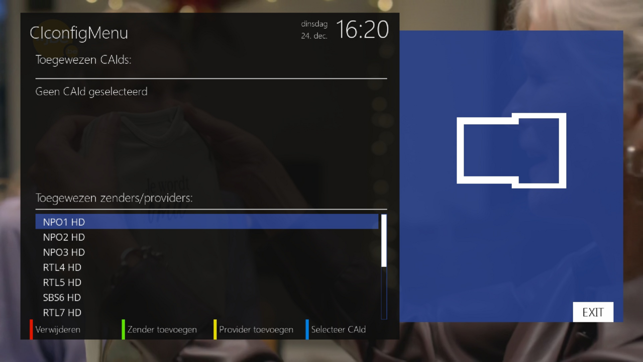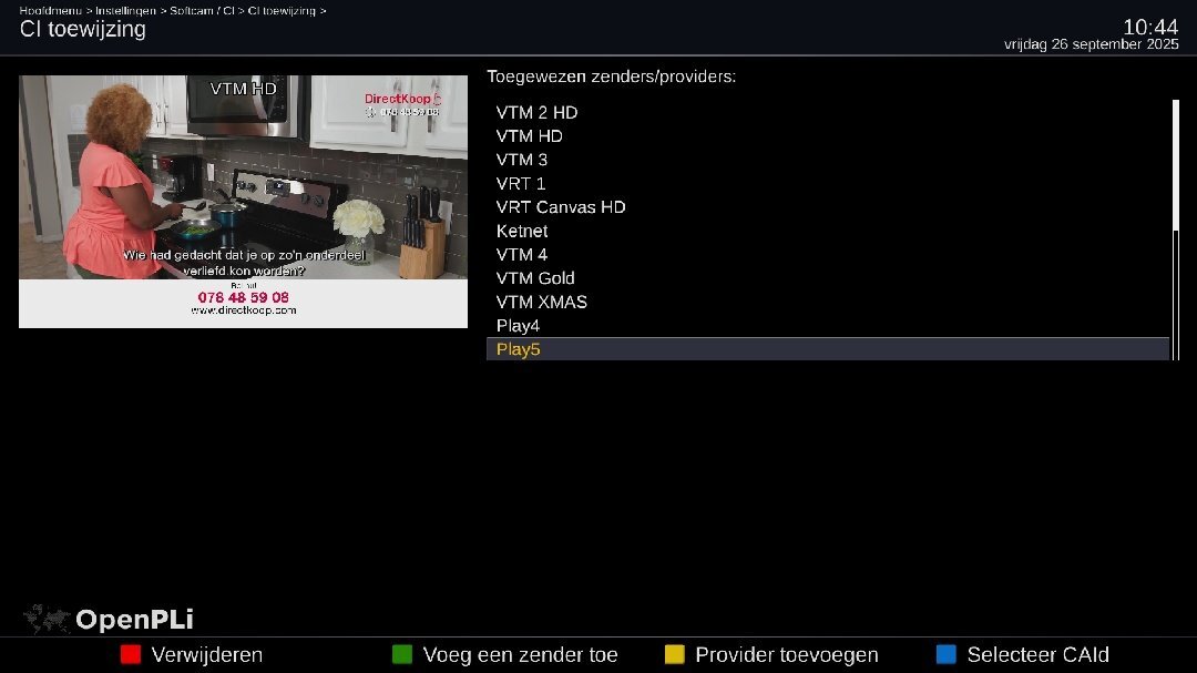 2. Work-around is opnemen van PLAY7 (tuner A). Bij kiezen van RTL4 schakelt de ontvanger naar tuner B en is er beeld. Zappen naar alle CD zenders is mogelijk. Stopt de opname van PLAY7 dan blijft het beeld van RTL4 stilstaan. Nadeel van de work-around is dat er onnodig een opname op de harde schijf wordt opgeslagen. Is het mogelijk om CAM803 en de TVV zenders toe te wijzen aan tuner A? Hoe kun je de smartcard (OSCAM) en de CD zenders toewijzen aan tuner B?