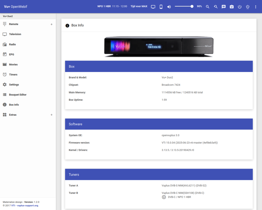 Na "lange" tijd mijn Vu+-duo weer aangezwengeld. Update gedaan, was zo klaar, ontvanger herstartte ook netjes (itt de ultimo's met OpenPli) Bijgaand een plaatje ter info. Alles werkt inderdaad prima maar het is net effe anders, het gaat wel sneller op deze ontvanger zo lijkt het maar het is ook een ander apparaat. Waarom ook hier alle opnamen als movie (film) worden benoemd dat blijf ik vreemd vinden, maar ja. En de HDMI werkt nog steeds :-)