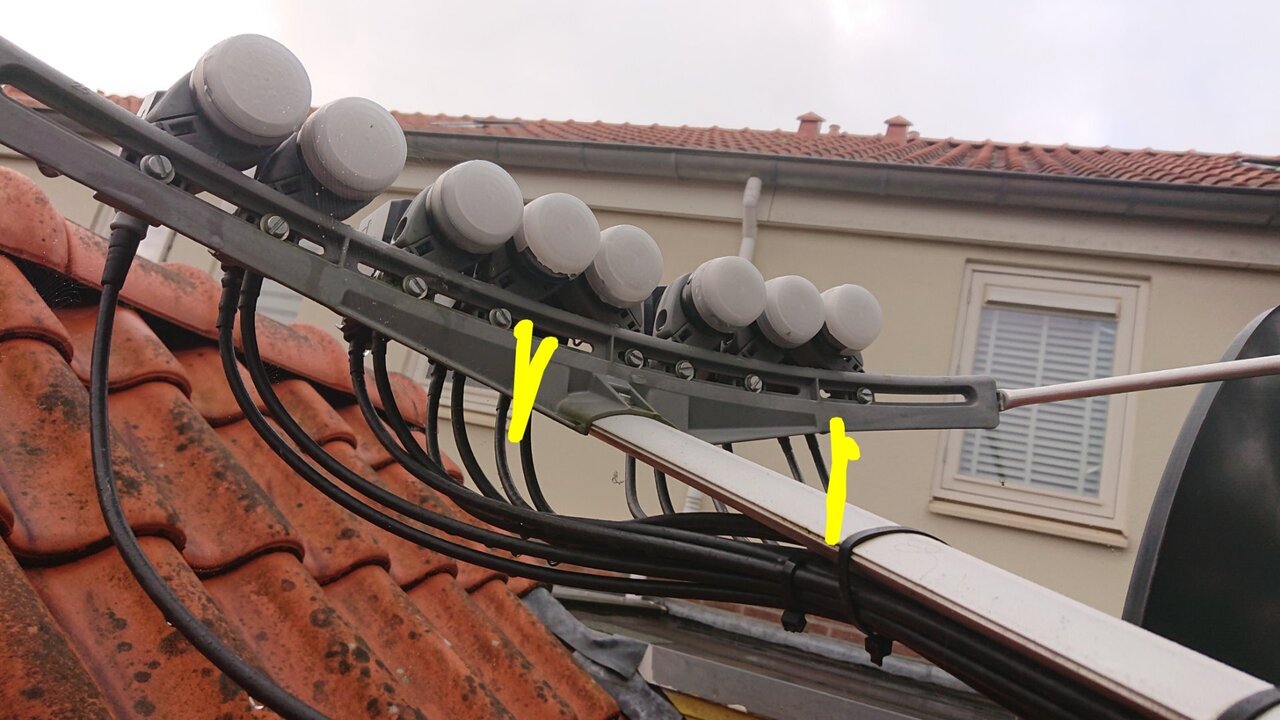 Omdat ik blokjes in beeld kreeg bij een aantal zenders (met normaal weer) ben ik eens gaan kijken. Het blijkt dat 5 van de 8 Inveto Ultra 7 twin ( 1 single) 40 mm lnb’s schade hebben. Barstjes aan de bovenkant van de afschermkap en bij 2 een stukje er uit. Die heb ik naar beneden gedraaid. Losse afschermkapjes zijn niet leverbaar heb ik begrepen en de kans dat ik ze vergoed krijg lijkt mij erg klein. Ik zal ze zelf moeten repareren. Wie heeft er een goed advies, met welk materiaal en zo. Op de foto’s is één en ander te zien Gele strepen de naar beneden gedraaide, foto 2 een beginnend barstje, foto 3 zichtbaar vocht onder de kap en een overzicht van opstelling.