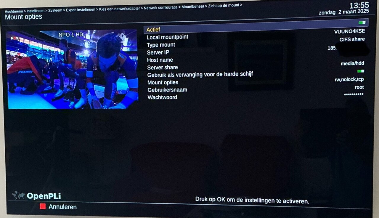 Zit op Gran Canaria. Heb fallback tuner hier werkend (via portforwarding in Praag), maar zou graag ook de HD van een vuplus in Praag op afstand benaderen. Heb in Praag ook een separate portforwarding voor de HD geactiveerd, dit werkt via de app Infuse remote op mijn AppleTV op Gran Canaria en zie dan de HD in Praag en kan deze afspelen. Via mountbeheer in vuplus zie ik geen mogelijkheid om IP tesamen met de portnummer op te geven. Is er een mogelijkheid om de HD remote op mijn vuplus hier te mounten? Gebruik openpli.