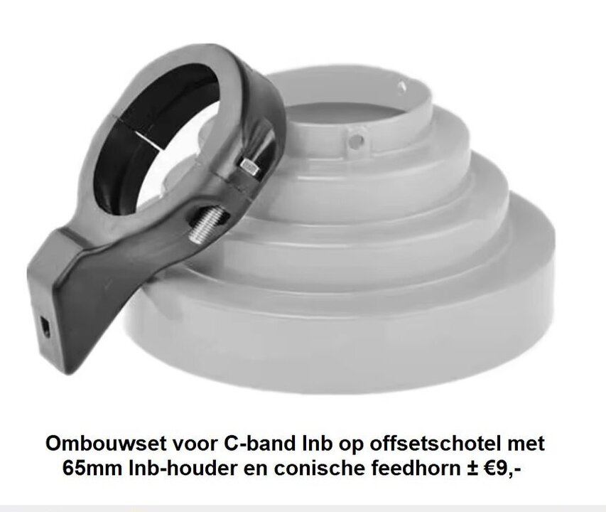 Nee, die lnb-houder past toch op de lnb-arm. Daar is een speciale ombouwset voor te koop. De reden is: Als je de schotel groter maakt, moet de lnb verder van de schotel af staan. Daarom heeft hij dat korte pijpje gebruikt. Maar er klopt natuurlijk allemaal geen hout van. Al met al zal hij wel wat meer signaal binnen halen want anders doen ze dit natuurlijk niet maar nooit zoveel als dat je een nieuwe schotel zou nemen met die grotere diameter.