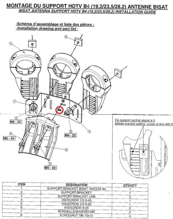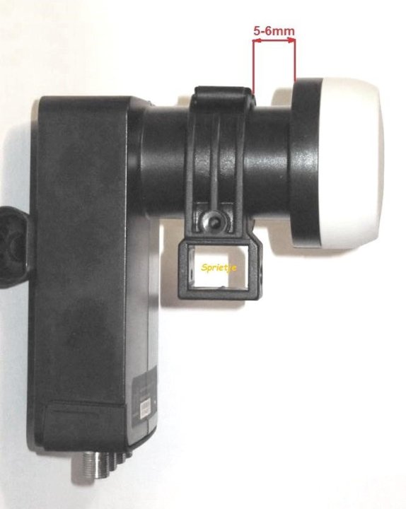 Stel de Triax 97 in Willebroek als volgt af voor de 13-19-23-28: - stel de elevatie van de schotel zo in, dat de bovenzijde van de rail in de richting naar de schotel horizontaal staat - zet de rail 12,5° schuin, de Astra 28,35 het hoogst. Gebruik hiervoor de waterpasfunctie van je mobile telefoon, een digitale waterpas of de bijgevoegde hoek van 12,5° met waterpas - monteer de lnb's in de klemmen zodat de kop 5-6mm van de klem zit (zie afbeelding) - plaats de lnb-klem van de Astra 19,2 tegen de arm - plaats de 13e-lnb op 74mm van de Astra 19,2-lnb - plaats de 23,5-lnb tegen de Astra 19,2-lnb. De afstand is dan 58mm - plaats de 28,3-lnb op 60,4mm van de Astra 23,5-lnb d.w.z. gemeten van kuiltje tot kuiltje in de kap aan de voorzijde van de lnb's -stel de skew van de lnbs als volgt in: a de Hotbird 13 op -3,5° b de Astra 19,2 op 4° c de Astra 23,5 op 7° d de Astra 28,35 op 11° d.w.z. t.o.v. verticaal, niet t.o.v. de rail want die staat al schuin. - stel de elevatie van de schotel in op 29,9° - richt de schotel nu uit op de Astra 23,5. Stel hem af op maximale signaalkwaliteit waarbij je behalve de draairichting ook de elevatie nog optimaliseert - de overige lnb's staan nu ook goed Opmerking. De 19,2-lnb staat 4mm verder van de 23,5-lnb af dan zou moeten maar kan niet dichterbij vanwege de kopdiameter van 59,5mm. Deze afwijking is bijna niet merkbaar omdat de Astra satelliet toch sterk genoeg is.