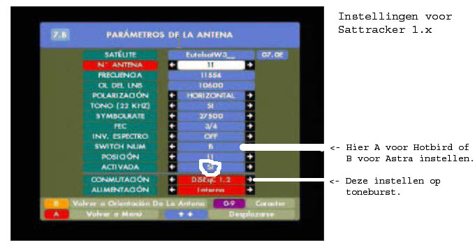 Kape Geplaatst: 21 mei 2004 Auteur Geplaatst: 21 mei 2004 Met Sattracker gaat het als volgt: -Zoek een kanaal op hotbird en richt je schotel hierop uit. - Ga in het menu naar optie 7, en kies dan B. - Instellingen: zie bijlage