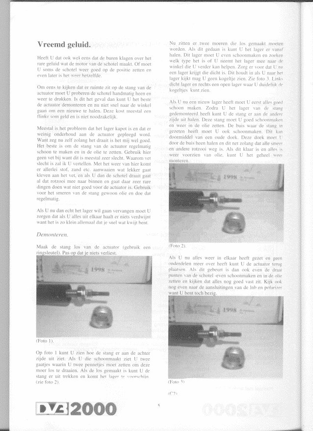 harry37 Geplaatst: 4 december 2004 Geplaatst: 4 december 2004 Naaimachine-olie lijkt me veel te dun; de regen kan dat zo wegspoelen. Ik gebruik kogellagervet. Daarmee smeer ik de bewegende stang in, in de uiterste stand, daarna schuif ik de stang een aantal keren in waarna ik het kogellagervet weer verdeel. Dit is overigens een surrogaat-oplossing voor het loshalen van de actuator. Het loshalen doe je door het motorhuis los te schroeven van de actuatorstang. Aan het einde van de actuatorstang heb je een soort dop zitten die je met een hulpstuk los kan draaien. Dit laatste is mij bij mijn al oude actuator niet gelukt omdat ik geen goed passend hulpstuk had en ook niet voldoende grip kon krijgen op de stang. Je kan niet te veel kracht uitoefenen op de stang omdat die dan zou kunnen vervormen. Daarna de kogels invetten (het best kan je ze loshalen waarbij je de kogels heen en weer beweegt om het vet zo goed mogelijk in het lager te krijgen). Ik heb een afbeelding bijgevoegd uit de DVB2000 gebruiksaanwijzing waarin e.e.a. wordt behandeld. Aangezien die gebruiksaanwijzing niet meer verkrijgbaar is, en het eigenlijk ook maar een off-topic onderwerp in die gebruiksaanwijzing is lijkt me dat niet zo'n probleem.