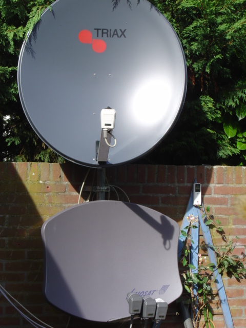 Gast Geplaatst: 15 april 2005 Geplaatst: 15 april 2005 Voordeel van 3 LNBs is dat je geen 'draaitijd' hebt. Als je een (twin) PVR tuner hebt kun je ook opnemen van een sateliet waar je niet naar kijkt. Nadeel van 3 LNBs is dat het (meestal) duurder is (zeker voor twin uitvoeringen). Voordeel van draaibaar is dat je dan altijd alle satelieten hebt. Heeft ook een hoge gadget-factor, binnen op een zapknop duwen en dan buiten gaat iets vanzelf draaien. Installatie is poepsimpel, ik heb het tijdens een sneeuw- en regenachtige winterdag gedaan, zonder geavanceerd spul (gewoon de TV voor het raam gezet om uit te richten). Afmetingen vallen reuze mee, 't is een extra 'blokje' op je beugel. Zoals op de foto hangtie bij mij ('t werd al donker kort na vier uur). (ik had geen rekening gehouden met het gewicht van mijn vooroorlogse wok, dus toen ik 'm los sleutelde lag ik bijna onderaan de ladder tussen de hortensia's).