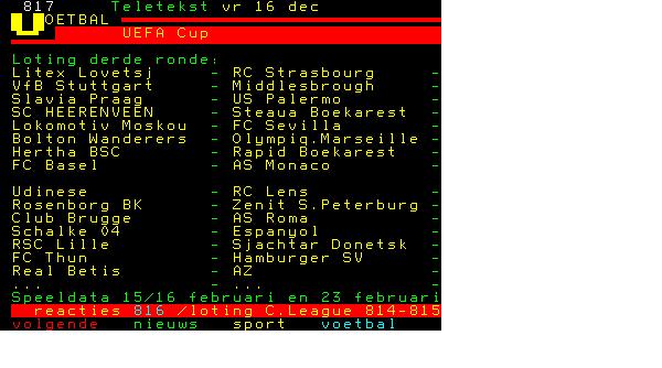 leo1949 Geplaatst: 16 december 2005 Geplaatst: 16 december 2005 Dit is het resultaat van de loting. Zie bijlage teletext pagina 817 NLD Leo Vroeger waren de kratten bier van hout en moest je zuipen om de kachel aan te houden Waar de darmen vol van zijn loopt de anus van over.