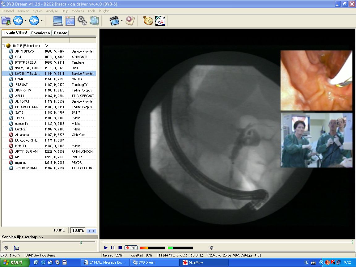 jalza Geplaatst: 13 oktober 2006 Geplaatst: 13 oktober 2006 CHANNEL Name: "D9/D164 T-Systems" Provider: "Service Provider" TRANSPONDER 11144000, V, 6111000 QPSK FEC 3/4 Satellite: 0100 - Eutelsat W1 Signal Level:35% Quality:24% IDs NetwordID:235 TransponderID:17185 SID:1 PIDs Video:512 Audio:4112 - eng (ISO13818) PCR=8190 PMT:2048 Teletext:0 DATE/TIME 13-10-2006 9:18:38 (GMT +1) REPORTER: jalza Dreambox 800HD 90 cm noname Draaibaar openPLI powerdDreambox 500HD 90cm Draaibaar OpenPli powerd2x skystar2 + Prof 7300 op draaibaar 90cm Arriva 102 mini voor onderweg.
