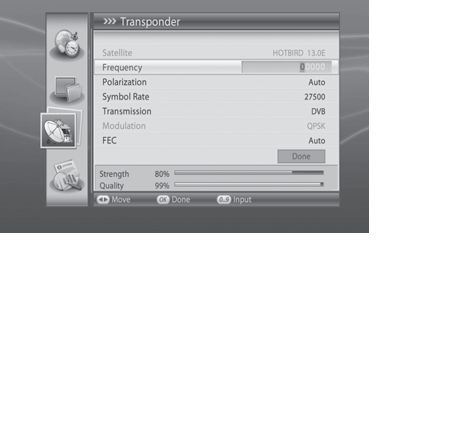 satencom Geplaatst: 24 juli 2010 Geplaatst: 24 juli 2010 1. Selecteer satelliet instellen en druk op de knop OK. 2. Geef de waarde voor Satelliet, LNB frequency, 22Khz tone, DiSEqC Input, LNB Power en Transponder. 3. Selecteer Opslaan en druk op de knop OK om te voltooien. Satelliet Selecteer de satelliet de antenne wijst naar en Druk op de knop OK. Als de vereiste satelliet is niet beschikbaar is, selecteert u Gebruikers Defi ne en voer de naam van de satelliet rechtstreeks. LNB Frequentie Selecteer de LNB-frequentie in en druk op de knop OK. Als de vereiste waarde niet beschikbaar is, selecteert u Gebruiker Defi ne en direct in de LNB frequentie. Opmerking: Als u kiest voor Universal, de 22Khz tone zal worden uitgeschakeld. 22Khz tone Selecteer in-of uitschakelen met behulp van de OK of < / > knop. Activeer Dual LNB wordt gebruikt of twee antennes zijn aangesloten op de 22kHz toon schakelkast. Schakel 22kHz toon is niet in gebruik is. DiSEqC Input Selecteer de optie DiSEqC input en druk op de knop OK. LNB Power Selecteer standaard of high en druk op de knop OK. Transponder Zet de transponder om het signaal te controleren. Selecteer de waarde voor de transponder. Als de gewenste waarde is niet beschikbaar is, selecteert u Gebruikers Defi ne en direct in de transponder waarde. 4. Voeg Transponder 1. Selecteer User Defi ne Transponder in en druk op de OK-toets. 2. Geef de waarde voor de frequentie, polarisatie, Symbol Rate, Overbrenging, Modulatie en FEC. 3. Selecteer OK en druk op de knop OK om te voltooien. Frequentie Voer de frequentie in met de CIJFERTOETSEN (0-9) knoppen. Polarisatie Maak een selectie uit Auto, horizontaal en verticaal in en druk op de knop OK. Symbol Rate Selecteer het symbool in en druk op de knop OK. Als het gewenste symbool geen koers beschikbaar is, selecteert u Gebruiker Defi ne en direct in het symbool tarief. Transmissie Kies DVB-S of DVB-S2 en druk op de knop OK. Modulatie Selecteer QPSK of 8PSK en druk op de knop OK. Volgens de wet van Bartjens moet het kunnen En met de vriendelijke groeten Hendrik En Is je Probleem opgelost? Help anderen door te vertellen hoe je dat hebt gedaan.