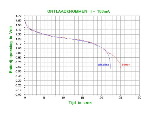 Een nieuwe batterij geeft wel degelijk meer dan 1,5 volt. Ik heb het dan over een batterij die nog lang niet aan zijn uiterste gebruiksdatum is en onbelast is. Bijgevoegd een batterijontlaadcurve met een belasting van 100mA. Deze start bij 1,6 volt. Hierin is wel te zien dat een batterij al in 20-30 minuten zakt naar 1,5 volt.