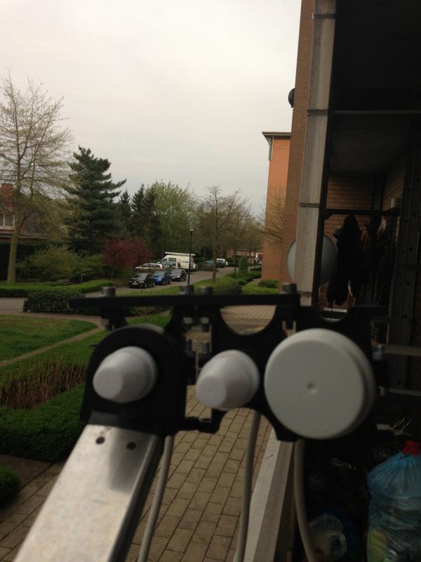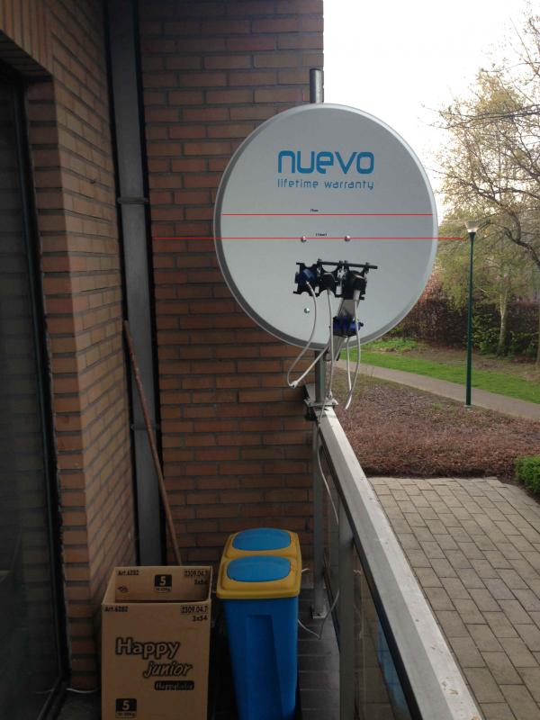 haramo Geplaatst: 30 april 2013 Geplaatst: 30 april 2013 Hey Nadat ik in een andere onderwerp, tot beslissing ben gekomen 6nieuwe LNB's van het merk inverto black premium te kopen( 3 voor mijn vriend en3 voor mij), overweeg ik om een nieuwe schotel aan te schaffen. Ik heb begrepen(zoveel gelezen op deze forum en andere forums) dat een grote schotel niet persé betekent dat ik betere signaal heb (bij regenval) maar als je meerdere LNB's hebt dan hoe groter hoe beter. Nu heb ik een schotel van 75 cm (van links naar recht gemeten) en volgende afstanden werden door Sprietje gemeten: Ik heb de afstanden even voor je uitgerekend voor Wilsele.De afstand tussen de Hotbird-lnb en de Astra 19,2 lnb moet 69,5mm zijn.De afstand tussen de Astra 19,2 en Astra 23,5 lnb moet 47mm zijn. Nu, wil ik overgaan naar een Triax schotel, aangezien mijn schotel niet echt bekend is , ook niet bij Sprietje. Ook wil ik een multihouder plaatsen en mijn schotel is er niet voor gemaakt en wil zeker niet beginnen met knutselen. Dus een triax multihouder is ok voor mij met een triax schotel. Welke diameter raden jullie me aan? ik dacht aan 90cm. de triax schotel die er dicht bij komt is de Triax 88 of triax 88 ANTR. Wat is het verschil tussen de gewone (witte) en de antraciet( zwart) schotel? Gelden de afstanden die Sprietje berekend heeft tussen de LNB's niet meer zeker, maar ik hoop dat ik de 40mm nog kan gebruiken op de nieuwe schotel. Als ik dan toch een grotere schotel neem, ga ik ook meer afstand hebben tussen de LNB's en dat is goed nieuws. Of is een triax 110 nog beter? zou die geplaatst kunnen worden op mijn balkon , ik zal een foto laten zien van mijn balkon en hoe ik de schotel wil plaatsen. Maar uiteraard, enkel als dat echt wel nodig is, die triax 110. Dan de opstelling van de LNB's, ik heb nog twee tamelijk goed werkende slim LNB's (23mm). stel dat ik de 3 nieuwe inverto LNB's ga gebruiken voor hotbird 13°, astra 1 19.2° en astra 3 23.5°. deze stelling wil ik zeker kunnen opstellen. Maar ik zou willen proberen om de twee slim LNB voor 26°(badr) en astra 2(28.2°) te gebruiken. als dit niet zou goed werken dan zou ik één van die twee satelieten willen ontvangen, dan kan ik wel een standaard LNB(60mm of ook 40mm)) plaatsen toch. Ik kan nog altijd die ene LNB verschuiven als ik echt iets wil zien op de andere satelliet :-) (geen goed idee zeker) Ik weet dat de multihouder van triax maar 4 LNB's aankan, zou ik dan zo een universele houder op kunnen zetten om zo extra LNB's te kunnen vastmaken? Maar als ik nu erover nadenk, want was het vergeten, de switch!, ik ga geen switch willen kopen met meer 8 aansluitingen. dus het zal ofwel de 28.2 zijn of de 26°. Maar zal de 26° geen probleem vormen? zeker in een multihouder (signaalverlies?) triax 88 voldoende of toch maar een triax 110? Mijn balkon zie foto toegevoegd (ondertussen is mijn balkon al bekend hier :-) ) Zou een 110 misschien te groot zijn, (omdat een deel binnen de balkon zit?) ik weet niet , ik zeg maar wat. Moet de astra 1 in de klem, ook als ik 26° of de 28.2° wil ontvangen? Maar het signaal wordt niet tegengehouden (zie andere foto). Op dit moment, kan ik hotbird, astra 1 en 3 ontvangen, met hotbird in de klem (omdat de klem te dik is en in de weg staat tussen astra 1 en 3 als astra 1 in de klem zou zitten) Mijn coordinaten zijn: 50.891494,4.700217.