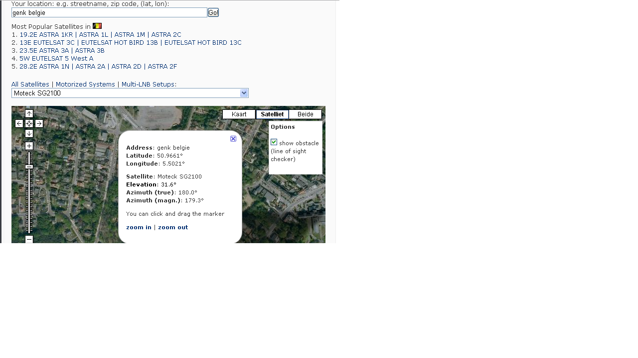 trust Geplaatst: 28 oktober 2013 Geplaatst: 28 oktober 2013 Dat is het hoogste punt , daar staat geen sat waar je op af kunt stemmen . Hoe wil je controleren dat je daarop gericht staat ? Het verschil tussen theorie en praktijk is mijn uitdaging . Octagon SF8008 4K Edision Primo IP S2 Dr.HD F16 1.8 m ChannelMaster Offset in tuin 53º E - 45º W Jaeger SMR 1224 Usals met 5 Lnb wisselaar 2x Ka - Ku - C band Lin / Circ 1.2 m Echostar Offset aan schuur 53º E 34.5 W Twoteck Twinrotor met 3 Lnb wisselaar Ku - Ku low - Ka