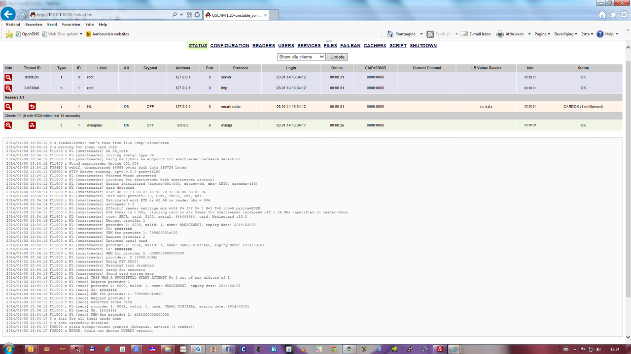 Nogmaals oscam draait op raspberry met smartreader die ook herkent wordt. Op de raspberry (server) de volgende configs  staan, oscam user, oscam config, oscam user en oscam dvbapi.