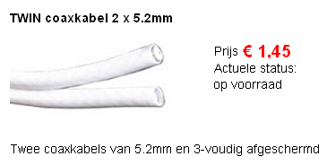 Sprietje Geplaatst: 16 januari 2014 Geplaatst: 16 januari 2014 Ik heb je een persoonlijke mail gestuurd. De 5,2mm dunne coaxkabel in twin-uitvoering kost bij een bekende Nederlandse satellietwinkel €1,45 / meter.
