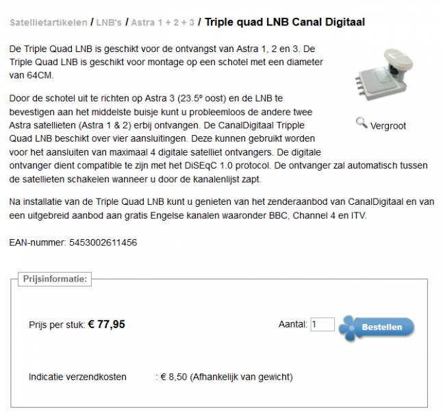 Tapaz Geplaatst: 29 mei 2014 Geplaatst: 29 mei 2014 Na het lezen van meerdere posts op dit forum heb ik besloten om te kiezen voor een tripleblock met 64 of 78 schotel. Dat lijkt me voor mij toereikend en net iets eenvoudiger te installeren. Qua prijs maakt het niet zo veel uit. Zie op dit moment de meerwaarde niet van Hotbird, maar die zal er ongetwijfeld zijn.