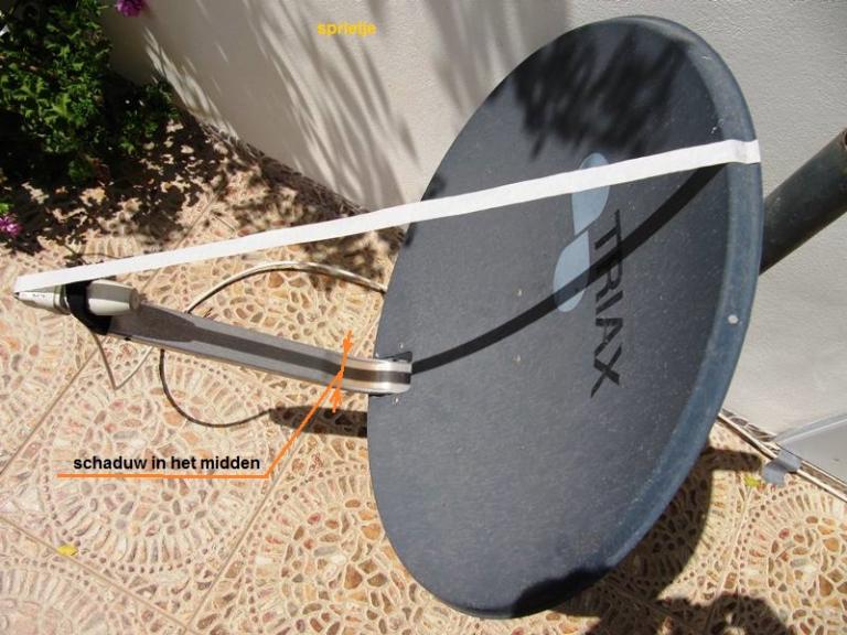 Sprietje Geplaatst: 17 september 2014 Geplaatst: 17 september 2014 Zet de elevatie van de schotel op 38 graden. Het statief moet natuurlijk wel zuiver verticaal staan.De Astra 19,2 staat waar de zon om 12.38 uur staat.Plak schilderstape van precies midden boven op de schotel naar de lnb.Om het midden boven op de schotel te bepalen kun je het beste even een latje precies horizontaal boven op de schotel leggen. Waar het raakpunt is, dat is het midden van de schotel bovenop.Span nu die schilderstape strak over het midden van de lnb die in de klem zit.Morgen op de aangegeven tijd moet de schaduw van het plakband precies midden over de lnb-arm lopen, zie de bijlage.