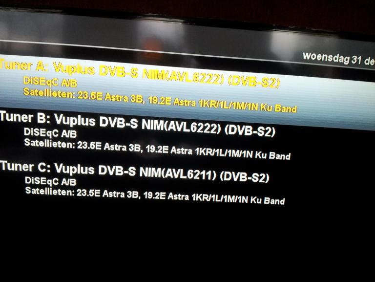 SimonLeBon Geplaatst: 1 januari 2015 Geplaatst: 1 januari 2015 Even een Update Alles in de vrije dagen geinstaleerd, en werk perfect, nu Tuner a/b Combi tuner, SNR 91% AGC 84% 14,8db Tuner c single (orgineel) SNR 91% AGC 99% 14,7db Vraag 1 Is een dubbele tuner minder gevoelig? Vraag 2 Wat is belangrijk SNR / AGC / DB Vraag 3 Hoe kun je de ontvangstwaarden nog beter krijgen, las ergens op forum over 99% 16db Vraag 4 Maakt het nog uit hoe je de disecqc insteld, per tuner of tuner b en c als a bv. 1 Dat kan, maar het kan ook omgekeerd zijn. Een te gevoelige tuner kan ook overstuurd raken door een te sterke zender Als je dan een zwakke zender in de buurt van de sterke wilt ontvangen, kan het zijn dat de ontvanger 'dichtgedrukt' wordt, maar dat heb ik eigenlijk nog niet meegemaakt bij satellietontvangst (en ik ben ooit met analoge ontvangst begonnen met deze hobby, nog voor het DVB-systeem). 2 Probeer de SNR iig boven de 60% te houden. AGC = de sterkte van het signaal (bij satellietontvangers dan). Kun je nergens de BER waarde vinden? Die moet zo laag mogelijk zijn en blijven, liefst 0. 3 -Met zo veel mogelijk metaal ofwel een grote schotel, T90 is voor Astra echt wel groot genoeg, Je zou een 120cm-180cm schotel kunnen overwegen, al is dat in dit geval toch wel weggegooid geld. -Goed uitrichten en de kop in de juiste positie (Skew) draaien. Op een satellietlocatie hangen meerdere satelieten, je kunt het best uitrichten op de zenders die jij het belangrijkst vindt. -Kop goed in het brandpunt zetten, de kop dichter/verder van de schotel plaatsen (in de houder dichter naar/verder van de reflector schuiven) -Bij lange lengtes, goede kabel (met lage demping op hoge frequenties) bijv KOKA 9TS, KOKA 799 Belden H125 Woon je in de buurt van 4G masten, kabel met goede afscherming (hoge instralingsdemping). -Zo min mogelijk verbindingen, elke verbinding (F-connector) kan het signaal bijna halveren, crimp je connectoren zorgvuldig of gebruik Cabelcon connectoren als je niet wilt crimpen/schroeven. Bij een electronicawebwinkel van Duitse origine (R******t) zijn deze connectoren niet zo duur. -Goede waterdichte verbindingen maken voor de connectoren die buiten gebruikt worden. -Niet gebruikte in- en uitgangen voorzien van eindweerstand -Vermijd aardlussen en potentiaalverschillen, zorg voor een goed centraal aardpunt (bijvoorbeeld je multiswitch). -Vermijd te krappe bochten in de coax Al deze zaken maken een klein verschil, de meeste winst win je met de schotel. Een bekend gezegde onder radio-amateurs is: "Buy a 10$ radio and a 100$ antenna" 4 Voor de gevoeligheid maakt dat niets uit. Zelf ben ik nu ook een GSO (4*SAT+DVB-T + 3m) aan het opzetten. Heb bij de bekende satwinkel (C*********) negenaderige Multikabel besteld. Ik gebruik dat 2 keer om de vier Inverto Ultra Quattro LNB's, een logper (DVB-T) en een FM dipool met de multiswitch (EMP MS17/12-PIU) te verbinden. Van de multiswitch ga ik naar 9 antennedozen in huis met KOKA 9TS (Ik was bijna door de 799 heen). Moet nog wel een wisselfilter maken (of stacker) voor het samenvoegen van de FM- en DVB-T-signalen. Ook ben ik bezig om een mastje neer te zetten voor SDR.