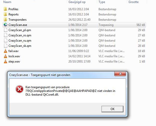 Crazy Sat Geplaatst: 30 december 2014 Geplaatst: 30 december 2014 Mooi dat het is opgelost. Graag maakt ik gebruik van dit draadje voor het volgende probleem. Als ik crazyscan wil opstarten krijg ik steeds volgende melding. Iemand een oplossing om dit te verhelpen ? feedhunting , a crazy hobby ! Edison OS mio 4K UHD + Octagon SF8008 4K UHD + Dr.HD F15 + Edison OS mini + Technomate TM-5402 HD M3 CI , Moteck SG2100 + Deltastar 90 cm + Invacom C120 QDF-031 Quad lnb + SkyStar HD2,TBS5927 , en TT-budget S2-1600 kaart. Channel Master 180 cm schotel + ESX241 lnb voor C-band. DVB-T2 via Oostvleteren,Egem,Mont des Cats,Bouvigny en Doornik.