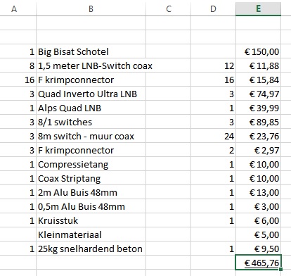 Zo, het loopt desondanks toch behoorlijk op. Vele kleintjes maken een grote.  Wat echt wel bijzonder is, is de lage aanschafprijs voor goede LNB's. Er zit toch wat loodgieterswerk in (feedhorn, micro-antennes) en de bak electronica voor een quad is toch ook niet gering. En dat voor minder dan 25,- per stuk!